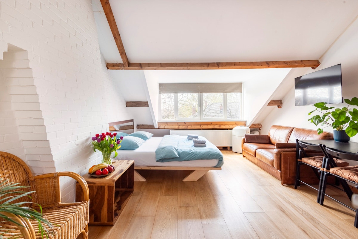 Gorgeous loft located in the Jordaan with a very laidback/relaxed atmosphere at home. The photos show a realistic image of the loft. Look no further, this is your 5*hotel alternative! Please no loud music after 8pm, max 2 ppl. Wanna drink&party? Please book a hotel! Pick up from/drop off to the airport by my driver Henry (Lexus ES300h/Mercedes EQE) is included in the price when staying 5 nights or longer. Ceaning fee (€80) needs to be paid cash upon check-out. Loft is on the 3rd and top floor.