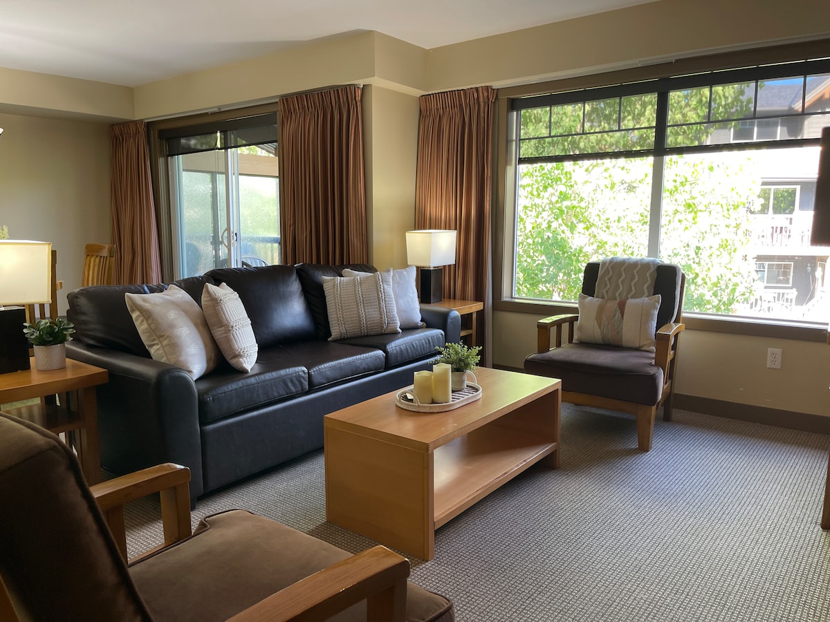 This bright 2nd floor CORNER suite is your ultimate home-away-from-home, inviting and beautifully appointed, featuring 1 bedroom, 1 bathroom, a living room and a full kitchen. It comes with In-FLOOR-HEATING and Air Conditioner (Air Conditioner will be available from May 1 to Sept 15 only). No more cold feet with turning IN-FLOOR HEATING! Step outside on your private balcony to soak in the mountain View, enjoy early morning coffee and evening wine!