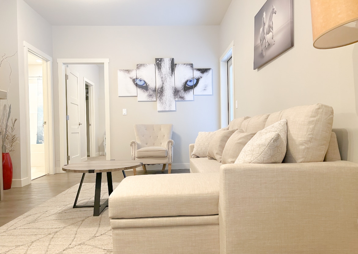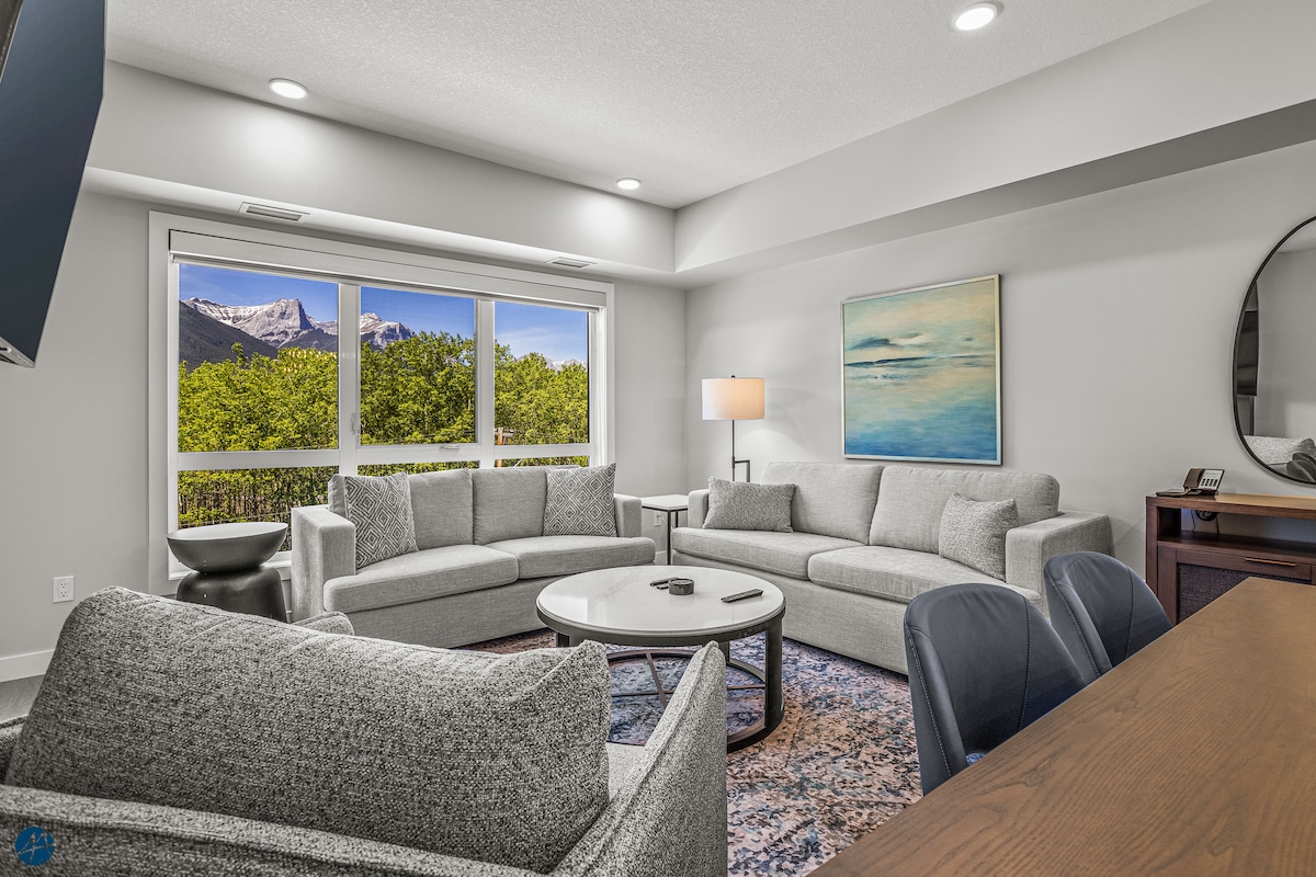 This top floor fully furnished large 1-bedroom suite is a perfect base to experience the Canadian Rockies. - 8 min Drive to Canmore - 25 min Drive to Banff - 30 min Drive to Kananaskis Village - Free Banff Park Pass - Free High Speed Wi-Fi & Cable - Private Balcony backing onto a treed lot with glimpses of Pigeon mountain - Living Room with cozy Fireplace and a plush couch that can easily be converted into a comfortable Queen bed - Full access to resort's shared amenities like Hot Tubs & BBQs