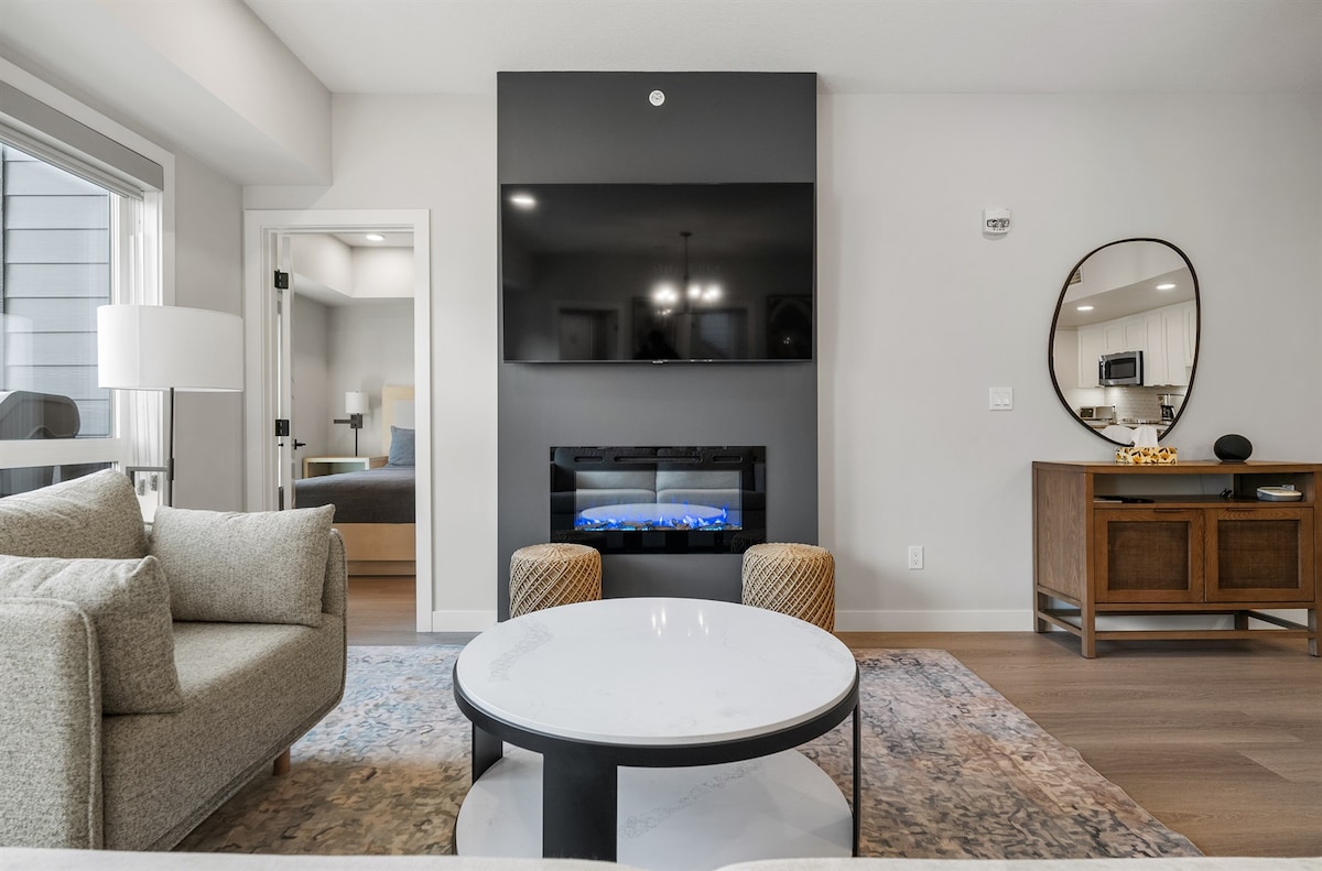 - Pool Now Open! Ground floor condo with easy access to Calgary, Canmore, and all of your mountain adventures! Complete with new furniture helping to make your stay as comfortable as possible, Two tv's in the unit for your downtime, big comfy bed for resting up, and a kitchen with high quality appliances should you choose to do some cooking at home. The unit has underground parking. To Note: - Construction in area, new resort being built - Parkade only 6'8" high. Some outdoor overflow parking.