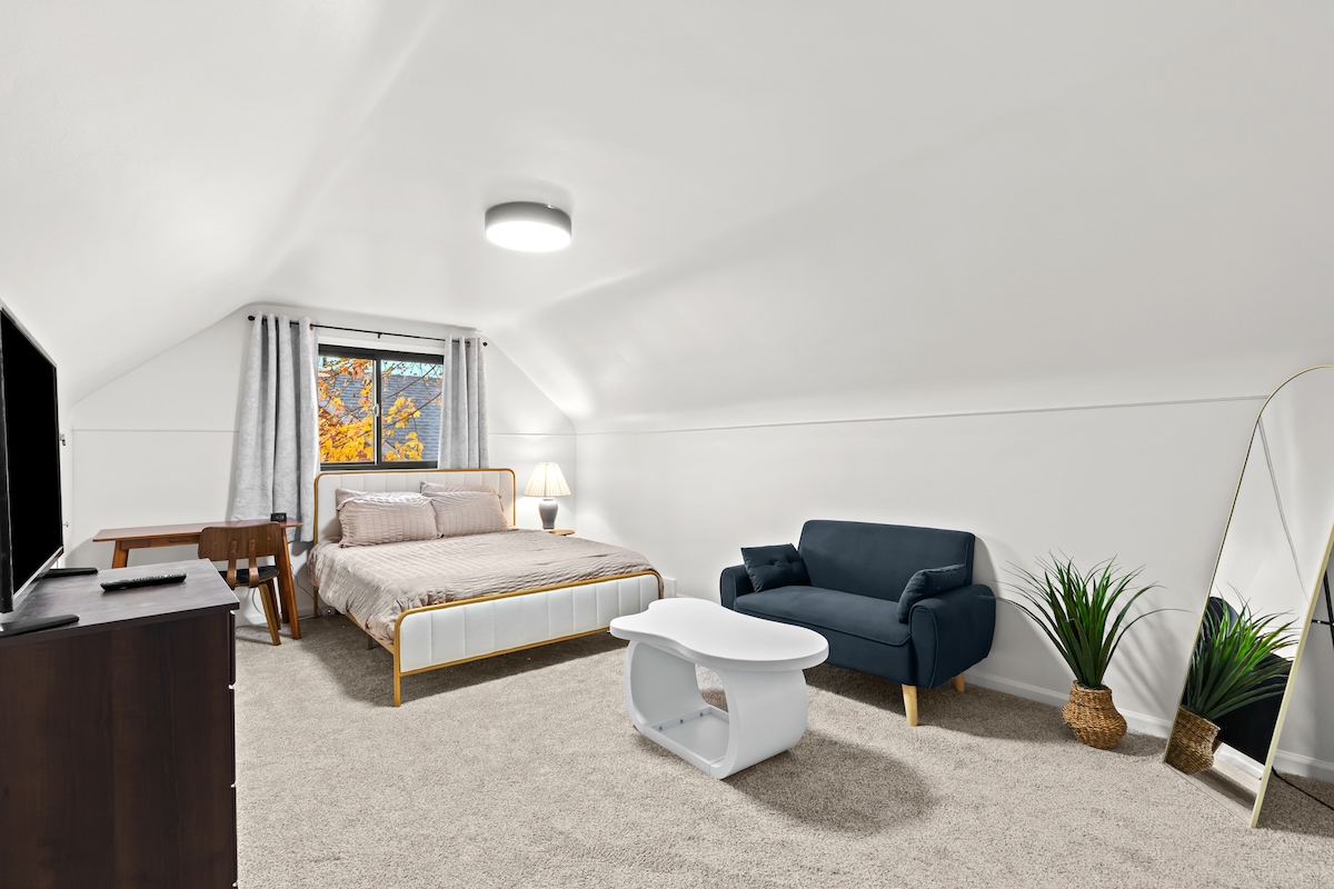Please note: prices are different for double occupancy. This unique attic studio apartment is a favorite among travelers, students and professionals alike. This airy studio apartment offers an open floor plan which includes a private bathroom, fully stocked kitchen, work space, integrated living room, dining area and bedroom with a queen size bed. 4 skylights offer plenty of natural light. While we have AC, the system struggles to cool the large space when outside temps exceed 85.