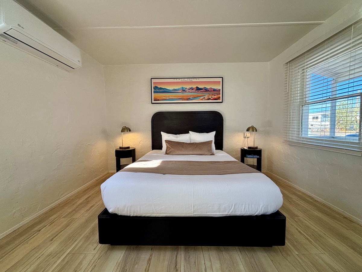 Stay in one of our cozy glamping trailers at Tarantula Ranch, just outside Death Valley NP. Enjoy stunning sunrises, sunsets, and starry skies overlooking our small vineyard. Each camper features a queen bed with linens, electricity, AC/heat, Wi-Fi, and outdoor seating. Shared amenities include composting toilets, bathhouse with toilets & shower, an outdoor kitchen, fire pits, and a community building with games. Perfect for a peaceful desert getaway while exploring the wonders of Death Valley!