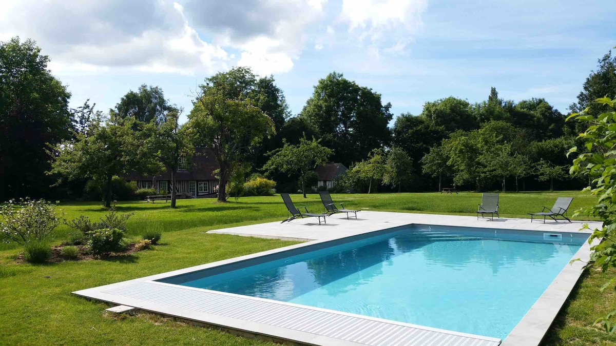 Charmante maison normande, rénovée avec beaucoup de gout. J'aime beaucoup la décoration, la maison est rénovée mais j'ai gardé le maximum de matériaux anciens. Attendez vous à un voyage dans le temps, avec le confort moderne. Grand jardin avec piscine chauffée à 28 degrés, la piscine est ouverte d'avril à septembre selon la météo . La plage est à 15 minutes à pied. Un grand séjour confortable vous permettra de profiter de votre voyage. Une salle de billard est à disposition à l'étage.