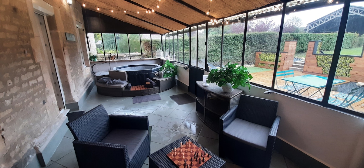 Venez profiter en couple, en famille ou entre amis de ce spacieux logement, décoré avec goût. Situé à 3 min de Pont-L'Evêque,15 min de Deauville, Trouville et Honfleur, ce gite lumineux offre un accès direct et privatif à un espace détente couvert équipé d’un jacuzzi avec vidéo projecteur. Situé dans un endroit calme, le gite vous offre une terrasse extérieure équipée (salon, table et barbecue) avec une magnifique vue panoramique et dégagée. Parking privé, Wifi, exposition sud, linge compris.