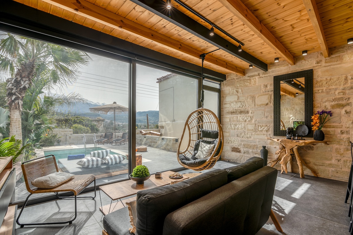 Hestia is an exclusive stone villa of 2018, part of Rhea-Residence dot com, with 3 houses, Hera, and Rhea, all totally private from each other, in Gavalochori, a beautiful village, 35 min drive from Chania, 3,5 km from the beach in Almyrida. The villa has stunning views to the White mountains, villages and the sea. The villa is ideal for a romantic luxury holiday for two or a small family.