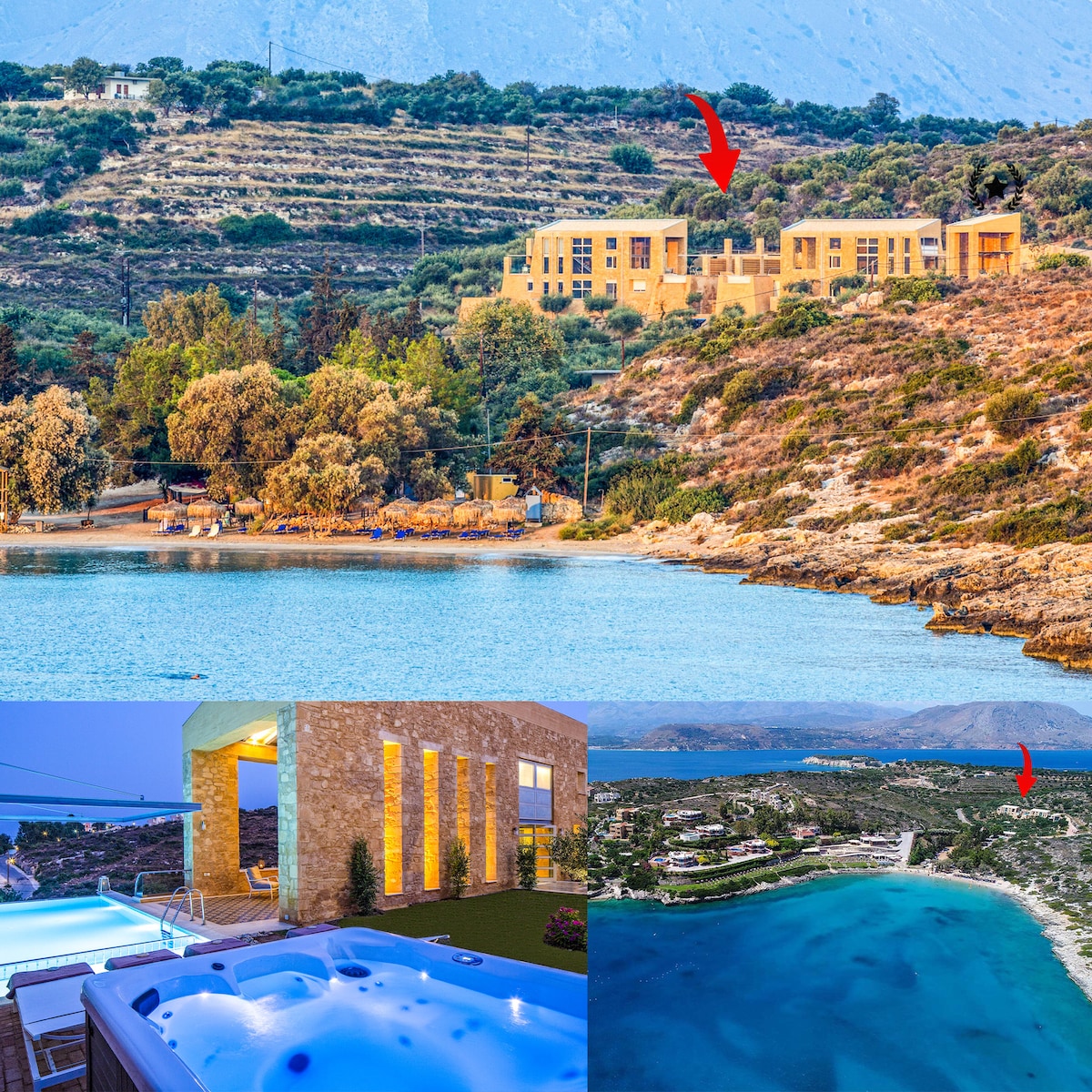 The second-floor balcony of your two-level villa offers a breathtaking view of Souda Bay. When you're not admiring the scenery, you can lounge at the pool deck, take a dip in the pool, or unwind in your private hot tub in front of the bedroom. Make sure to take a look at the pool deck lounge area equipped with a TV and fire table. You will be our only guests. The price includes the Climate Resilience Levy, which some places charge separately.