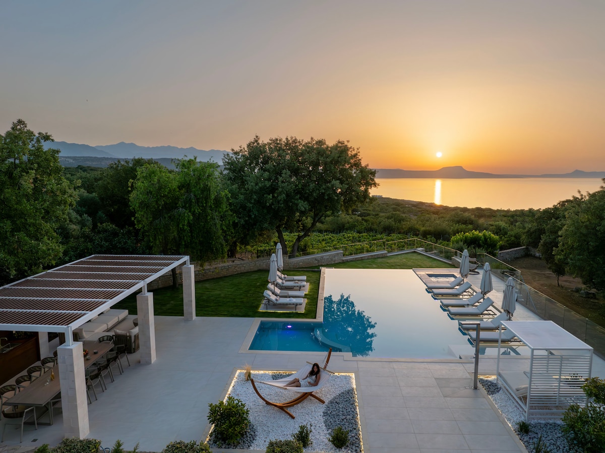 Looking upon the charming town of Kissamos, this sleek villa incorporates traditional Greek design with modern renovations. A citrus garden lends its refreshing scent to the breeze. Inside, sunlight bathes the white walls and sumptuous décor. At the edge of the terrace, a curved pool beckons you in for a languid swim. Sail along the vivid Aegean Sea, peruse a local museum, or frolic at the beach. Copyright © Luxury Retreats. All rights reserved.