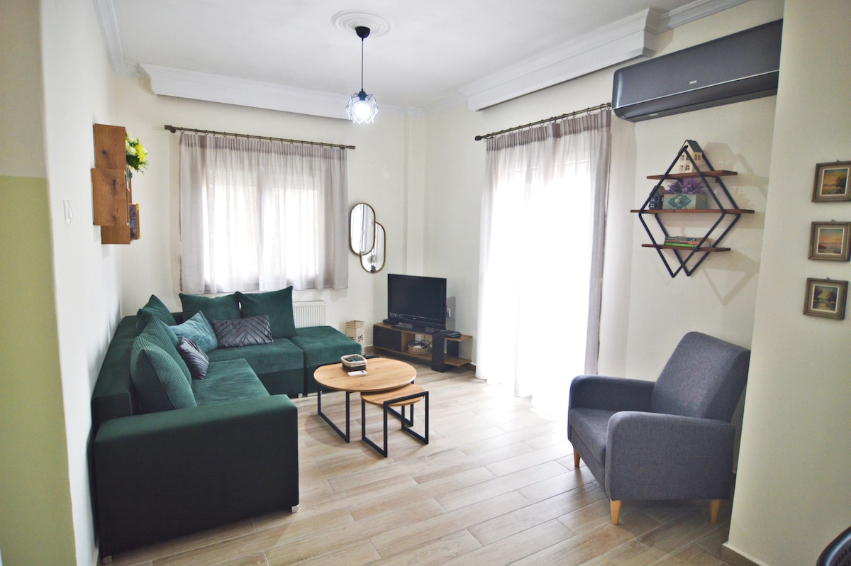 A getaway in Trikala, in a modern apartment with a lovely garden, just 1.3 km from the city center and 300 m. from Matsopoulos' Mill (industrial museum, cultural center, Christmas theme park "The Mill of Elves"). This lodge combines a high aesthetics, comfort, plenty of amenities, easy parking and privacy. Enjoy a "green" stay in Trikala combining coziness and safety.