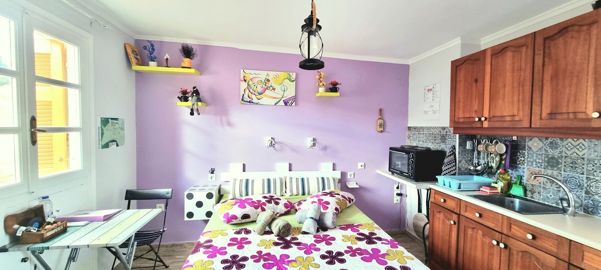 A comfortable little house with a garden that opens on the bay and the sea, offering a magnificent view of the sunset. A 10-minute walk takes you to the Alykes salt pans, where there is a "Natura" park with pink flamingos in the right season, normally in spring and autumn. Behind the house there is a private parking. Renting a car is highly recommended for getting around the area, visit villages and beaches, shopping, etc.