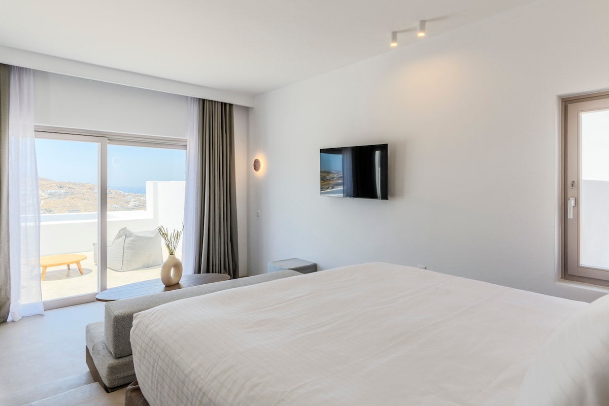 The suite is located at the top of the complex with uninterrupted stunning panoramic views of Delos,Naxos,Paros and the Aegean.Its secluded location offer its guest unlimited privacy.The indoor area is measured at 25sqm while the out- doors is 90sqm.From the double bed and the private pool, you can observe the breathtaking views.Inside the suite there there is an en suite bathroom with a shower and all the amenities necessary for you to have a wonderful stay.
