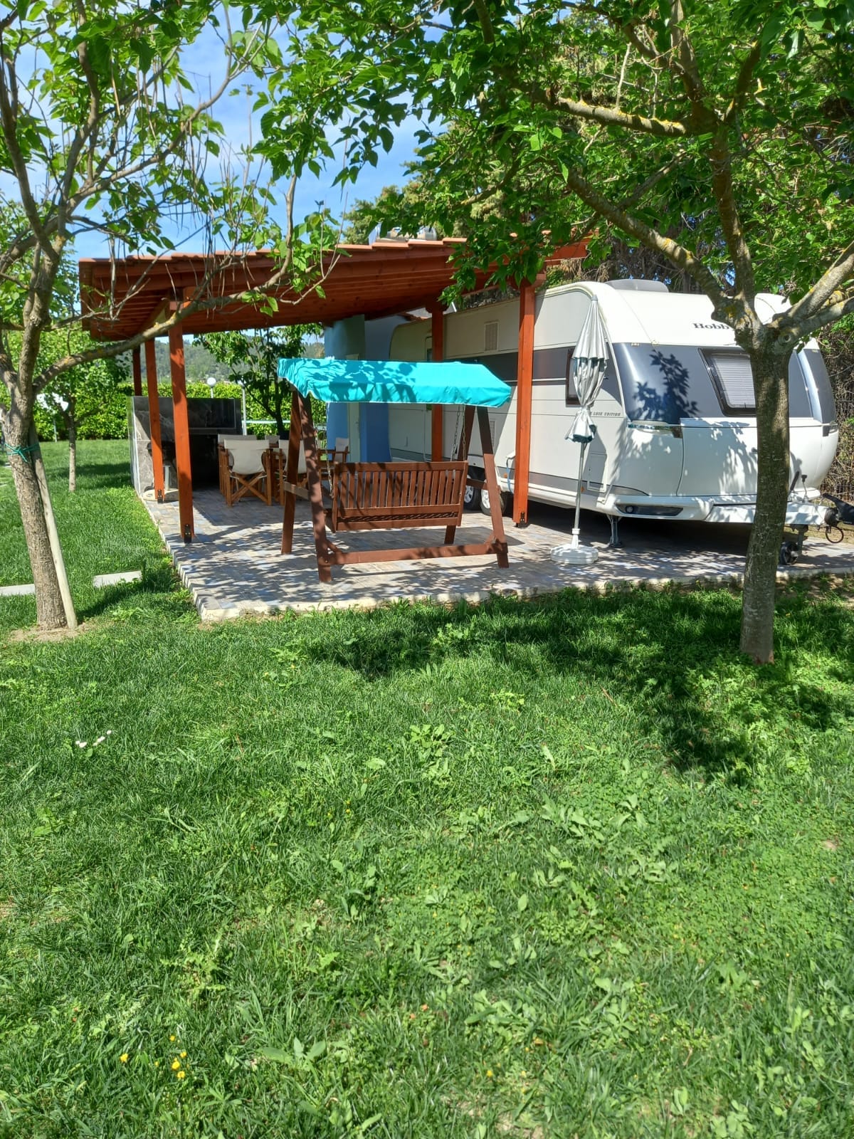 The caravan is located at peaceful and fenced land providing privacy and panoramic views to the sea and the surrounding hills. Suitable for couples or for families with up to two young children. Pets are welcome. A footpath leads down to the beach of Megas Gyalos at a distance of 10 minutes walking. Due to there is no access by car or motorbike the beach is always quite with very few or no people at all. During the night the views of the stars and the constellations are magical.
