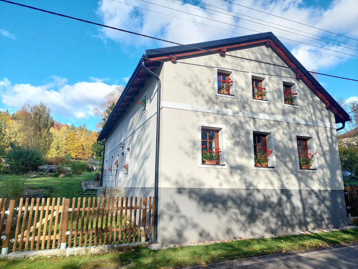 House (95 m²) with garden (1200 m²) on the border of NP Bohemian Switzerland and Labské pískovce offers accommodation for 6 people in 3 bedrooms and living room with fully equipped kitchen. Comfort is ensured by underfloor heating, Wi-Fi and TV (Netflix, Max). There are trails leading from the house to viewpoints, the famous sites of Hřensko and Pravčická brána (6 km), Jetřichovice walls (17 km) are within easy reach. The pleasant Nový Svět Biotope (600 m) will refresh you on hot days.