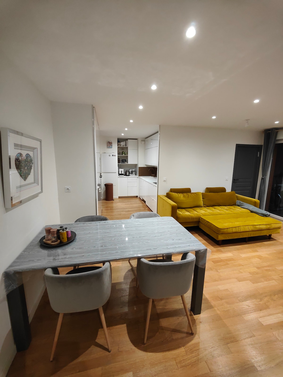 Logement moderne Secteur Grand Large dans résidence privée. Commerces de proximité, Groupama Stadium a 5min , 15 min de Eurexpo et aéroport. Desservie par Tramway et bus A 5 min du Lac Grand Large . Appartement lumineux de 90m2. 3 chambres ( 2 chambres doubles 160/200 et 1 chambre avec 2 lits simples) . Canapé convertible ( 2 couchages ) cuisine équipée ouverte sur le séjour.CLIM 6/8 voyageurs . Grande Terrasse de 20m2. Wifi / parking ext gratuit. Centre ville de Lyon à 15min