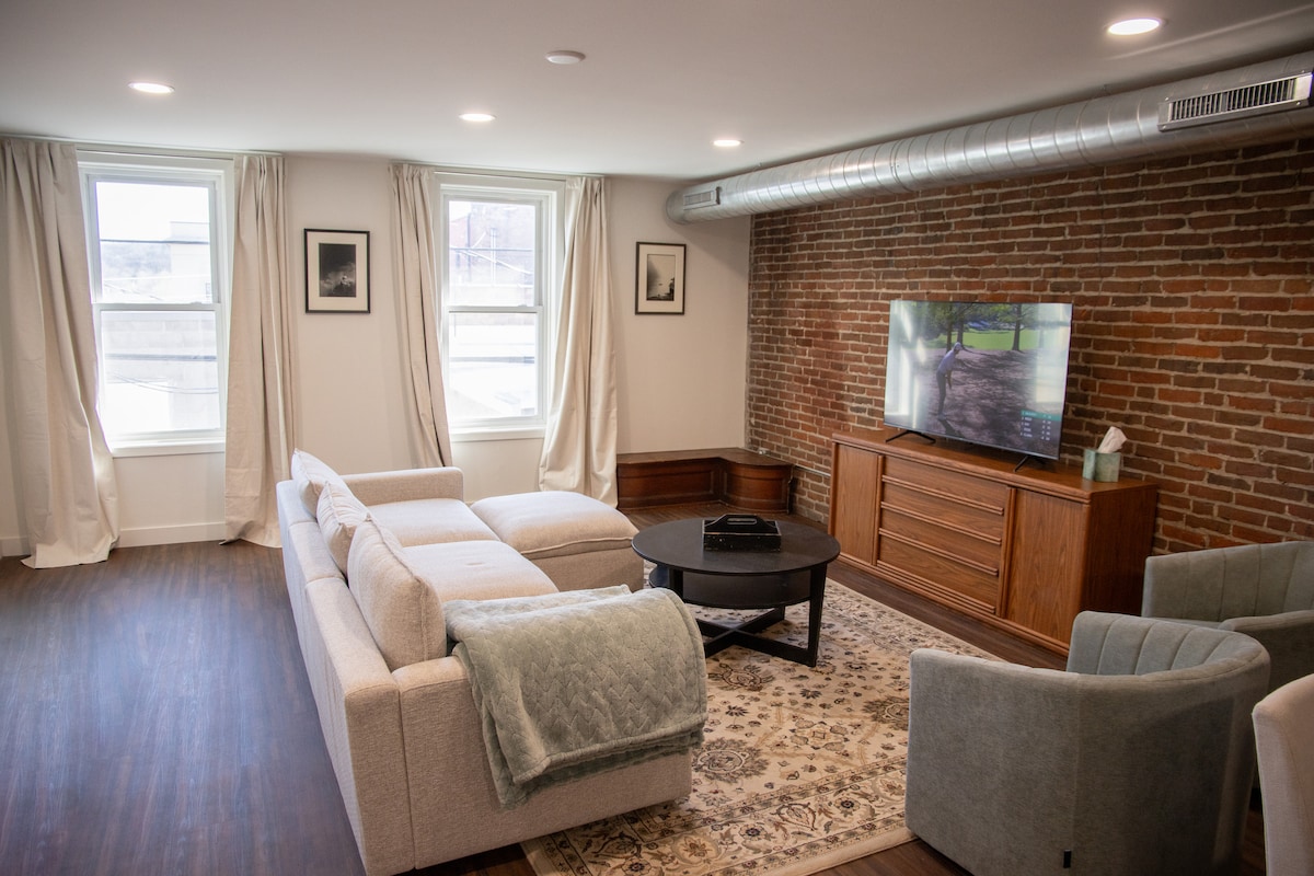 Experience modern comfort in this high-end renovated space located in vibrant downtown Decorah. Features include sleek furnishings, a designer kitchen, 12 foot ceilings, premium linens, and easy access to top dining, entertainment, and attractions. Views lookout over the main street.