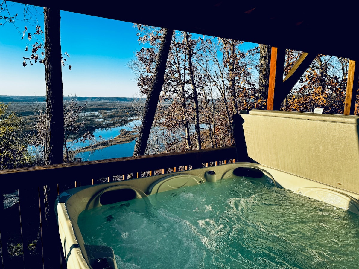 Take it easy at this unique, custom built, rustic cabin. Perched high on a bluff with an amazing view overlooking the Mississippi River. Sit around the campfire with your family and friends and enjoy the tranquility of the peaceful outdoors with a view to remember! Relax, while gazing up at the stars, in the outdoor Hot Tub. Three bedrooms and three baths in this newly built cabin. Open floor plan with a beautiful stone fireplace.