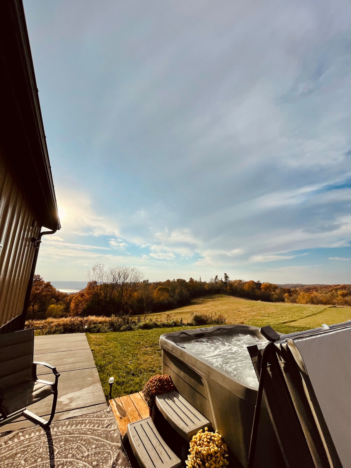 1 bedroom 1 bath with loft. Cozy home where you can see Paradise. This memorable place is anything but ordinary. Views for miles of the Mississippi River, bluff tops and you can soar with the Eagles. What a place to relax in the newly added hot tub while you enjoy the view in what is call "God's Country". This is promised to be a one of a kind view. The Deck with comfortable outdoor seating Located in the heart of WIsconsin's Driftless Region. New workout center for all our guest to use.