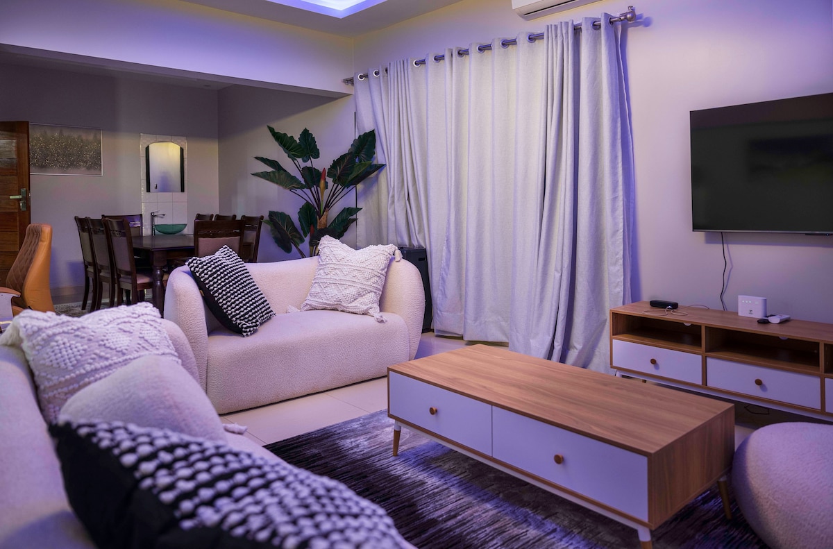 Enjoy a comfortable stay in this modern studio featuring a queen-size bed with mosquito net, air conditioning, ceiling fan, and private bathroom with shower. The kitchenette includes a stove, microwave, and mini fridge. Stay connected with high-speed Starlink internet and streaming TV. The apartment has solar backup for lighting, Wi-Fi, and TV, plus generator support during load shedding. Water backup ensures uninterrupted supply.