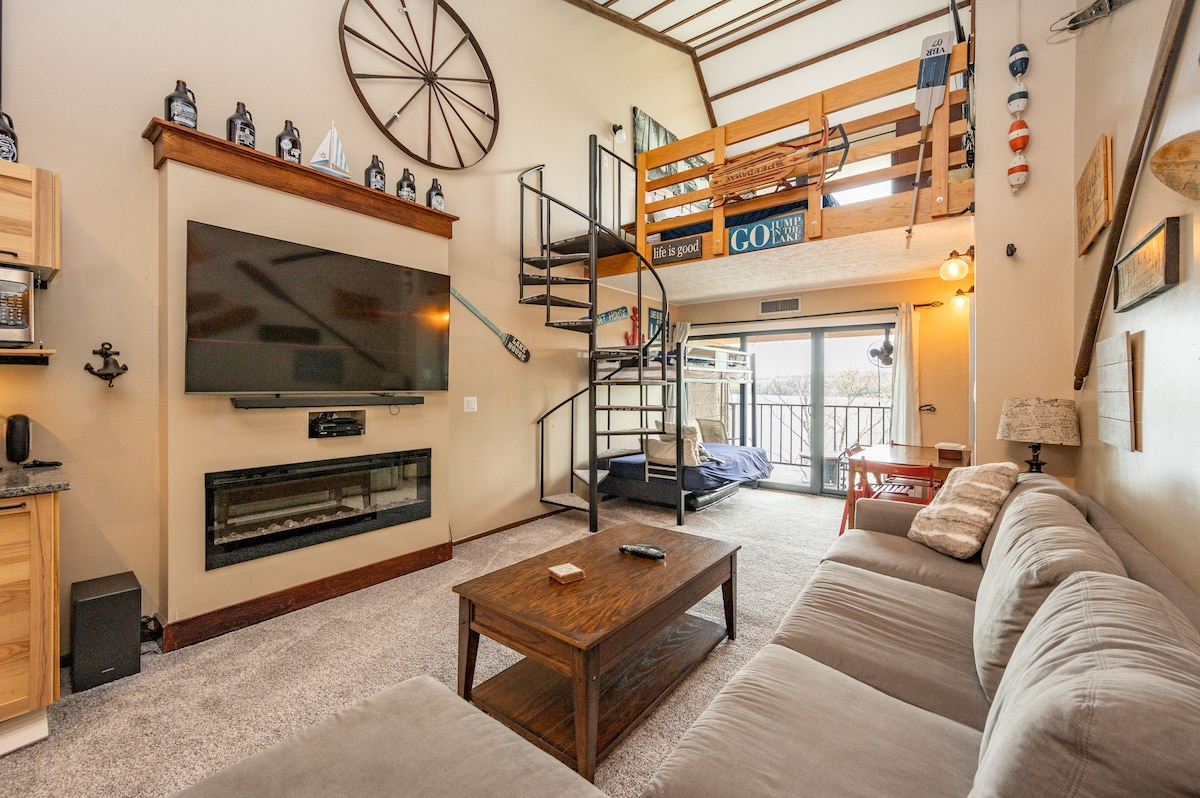 Lakefront studio loft, one-bath condo (end unit) with private patio, full kitchen and electric fireplace. (Elevator access included) Hotel amenities available to all guests: Indoor pool and split-level whirlpool hot tub, two onsite dining locations, 240' of sandy beachfront and docks, fitness center, game room, racquetball court, covered parking, free WIFI, and a lakefront view with every room!