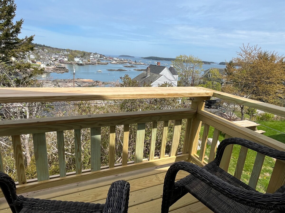 Dynamic ocean views in a Victorian in Searsport. 2 bedrooms with a futon in the sitting room. Deck overlooking Penobscot Bay. In town location is steps away from town wharf, groceries, Penobscot Marine Museum, and numerous antique shops. Minutes from Moose Point State Park, Sears Island, Fort Point & Fort Knox state parks, Penobscot Narrows Bridge & Observatory and Belfast. A half hour to Camden and Rockport. An hour to Bar Harbor and Acadia National Park.