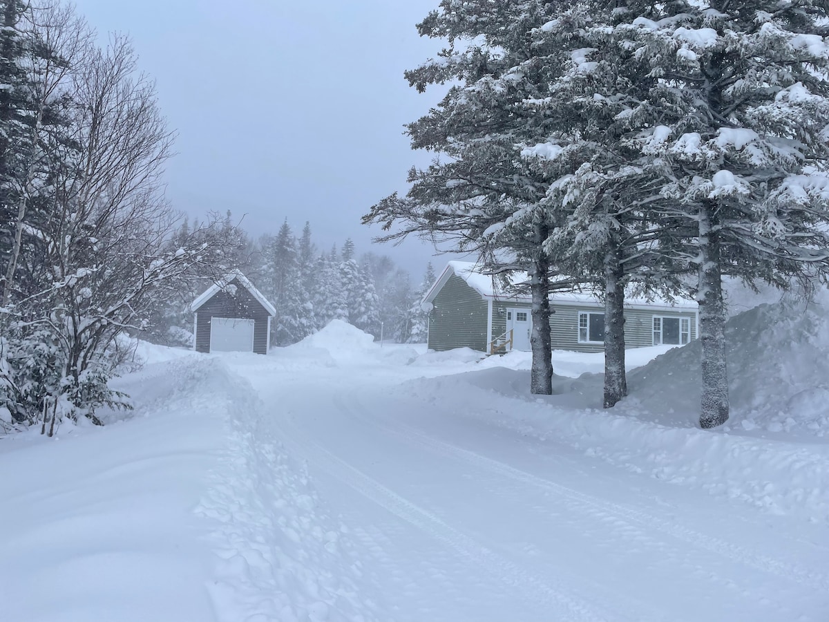 Sleeps 6 Very Private. 5 mins to AIRPORT, 40 mins from MARBLE MOUNTAIN and GROS MOURNE, 5 mins from INSECTARIUM and BEACH. Can access SNOWMOBILE trails from the house. There is a fully equipped kitchen & washroom, washer & dryer, private decks, office desk, FIBRE opt internet,Bell TV, & PLAYGROUND. The loft has two twin beds,one queen bed, and Bell TV. Downstairs bedroom has a queen bed. Pack & Play, books, & toys for the litte guests. Loft not suitable for small children without supervision.