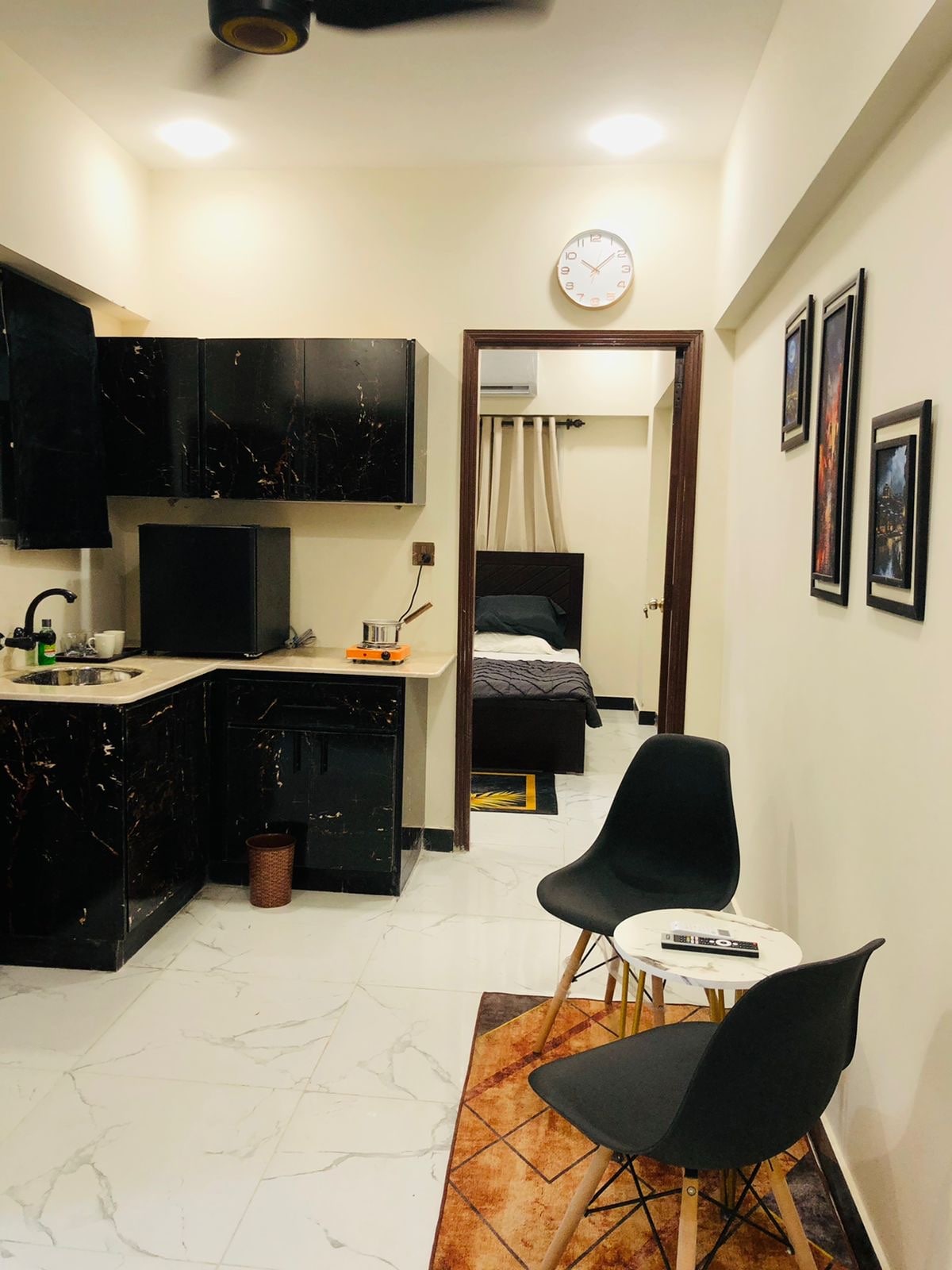 Welcome to our 1 BHK Apartment which is Situated in the heart of DHA Phase 6, one of Karachi's most upscale and secure neighborhoods. • Easy access to Clifton Beach🏝️ (2-3 mins drive). • Surrounded by popular commercial zones: Bukhari, Shahbaz & Nishat Commercial. • Close to trendy cafés☕️, restaurants🍽️, and shopping outlets.👗 • Nearby supermarkets, banks, and pharmacies for convenience. • Business travelers seeking a quiet location.📈 • 24/7 security.👮🏻♀️ •Secure parking space.