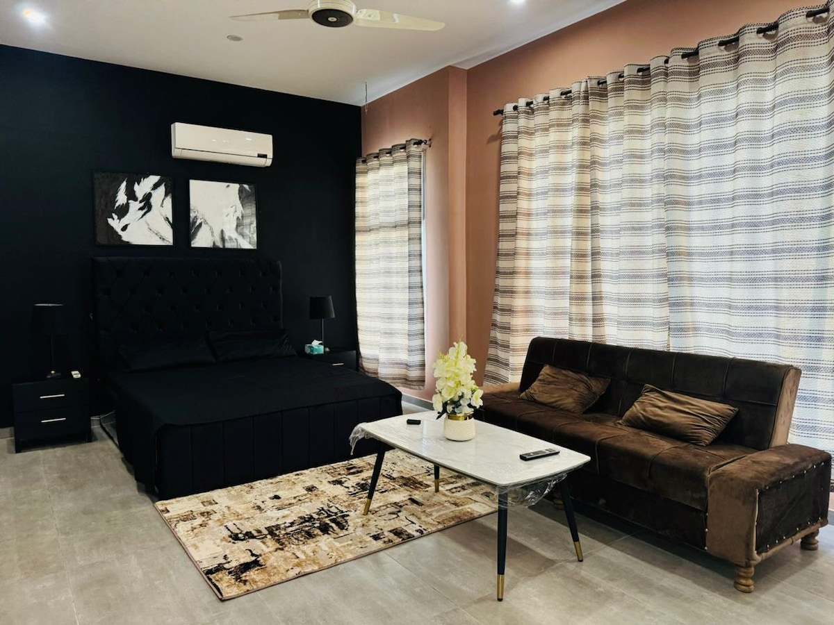 Black & Bean Studio blends espresso-toned walls, sleek black furniture, and crisp white accents for a chic, peaceful stay. Perfect for business travellers, families, or explorers, it offers large windows with sunset views, air-conditioned comfort, and a fully equipped kitchen. Enjoy 24/7 housekeeping, high-speed Wi-Fi, CCTV security, free parking, and lift access—all in a prime location near parks, Mosque, and local attractions.