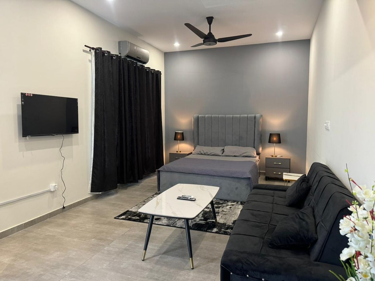 Luxury room in DHA Phase 8 with stunning golf, beach & marina views. Features king-size bed, premium finishes, seating area, work desk, smart TV with Netflix, and a fully equipped kitchen with coffee bar. Ideal for business travelers, couples, or solo guests. Surrounded by chic cafes, designer shops, and fine dining. Located in a fully secured, upscale neighborhood for a peaceful and stylish stay.