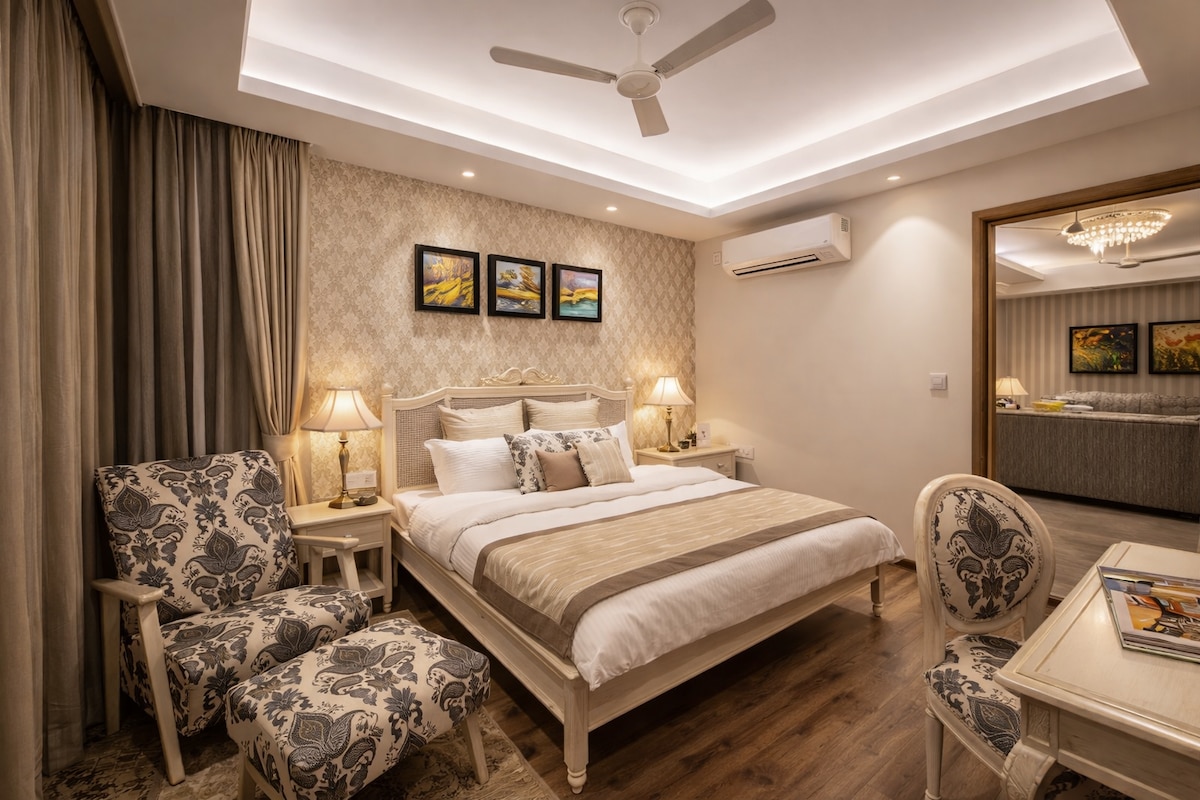 Welcome to Melody by AariaHomez a stunning family friendly luxury apartment nestled in the heart of the mountains, perfect for a romantic getaway or solo adventure. The apartment is just 10 minutes from Pacific mall Rajpur road & 60 minutes from the queen of hills Mussorie. - Comfortable King size bed with premium linens - Offer a kitchenette for your cooking needs - Modern bathroom with essentials provided. - Private balcony to enjoy your morning coffee - Smart TV and High Speed Wi-Fi