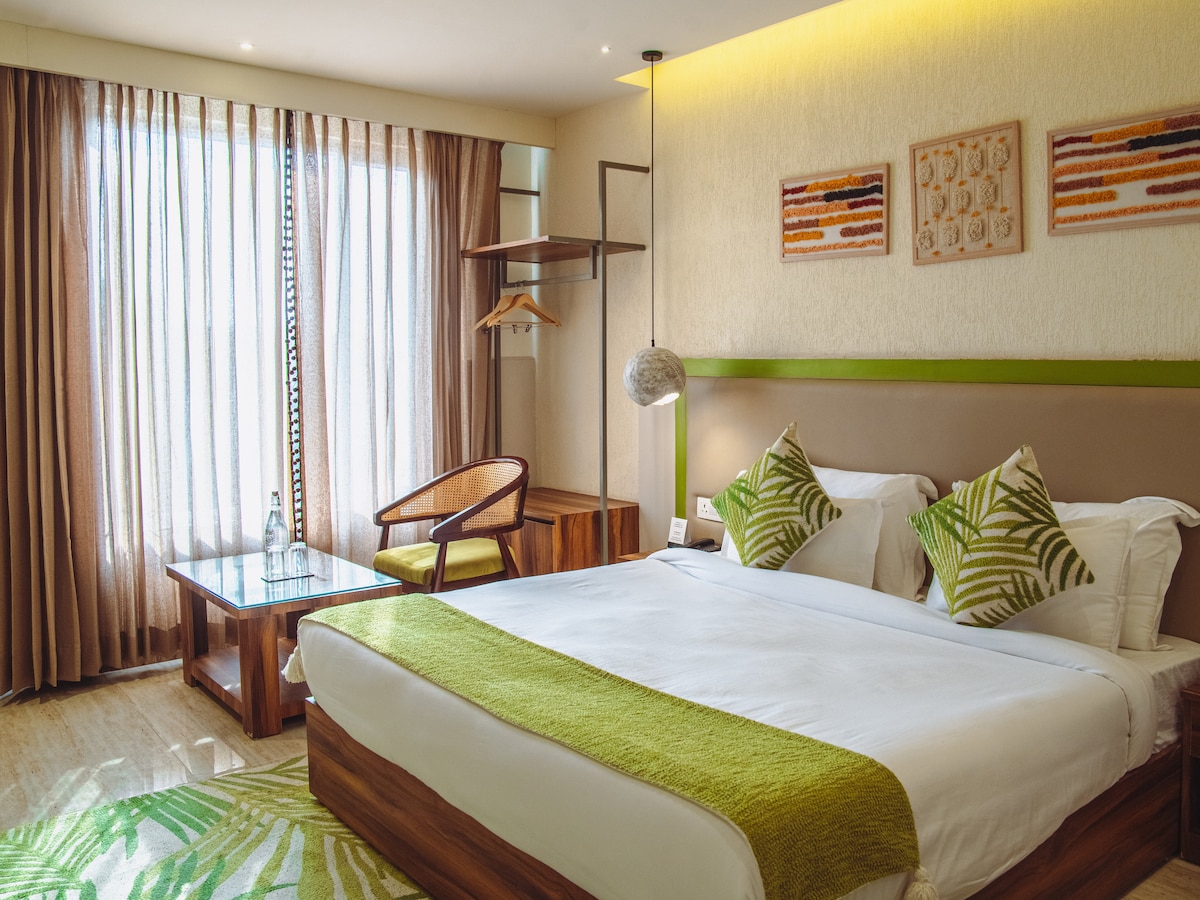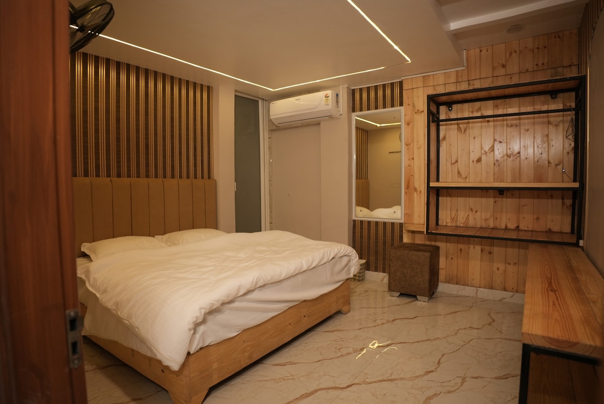 Experience a stunning wooden sanctuary where rustic charm meets modern luxury.this boutique suite features rich timber- paneled interiors,intricate handcrafted latticework,and sun drenched spaces.complete with a spa-inspired rain shower and premium climate-controlled comfort,it’s the perfect,cozy retreat for travelers seeking sophisticated style and a warm,organic atmosphere.