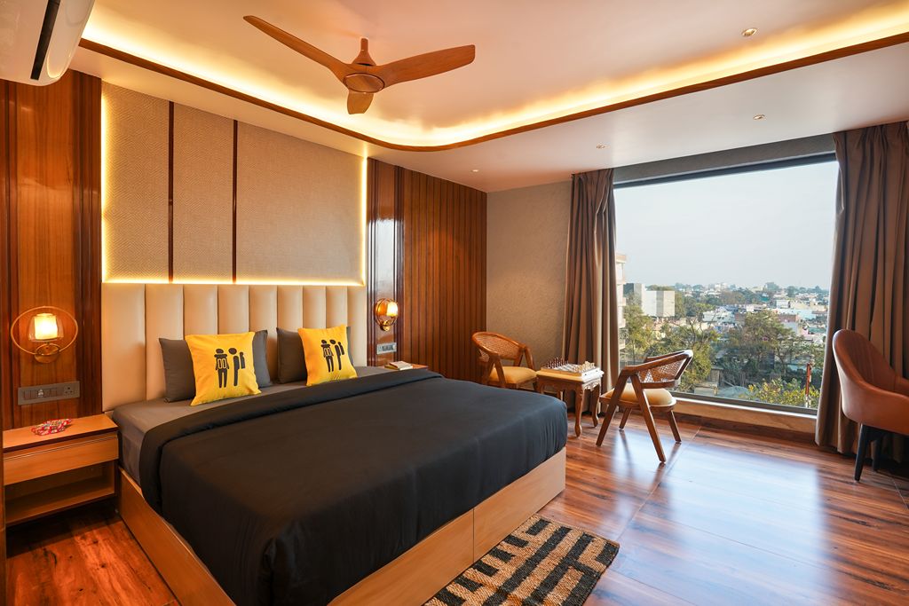 Experience modern comfort in our stylishly appointed rooms, featuring floor-to-ceiling windows with lush greenery views. Each room boasts a plush king-sized bed, ambient backlighting, and contemporary decor. Enjoy premium amenities including a private marble-finished bathroom, flat-screen TV, and a dedicated coffee station. Whether you're here for business or leisure, our sleek design and serene atmosphere provide the perfect urban retreat.
