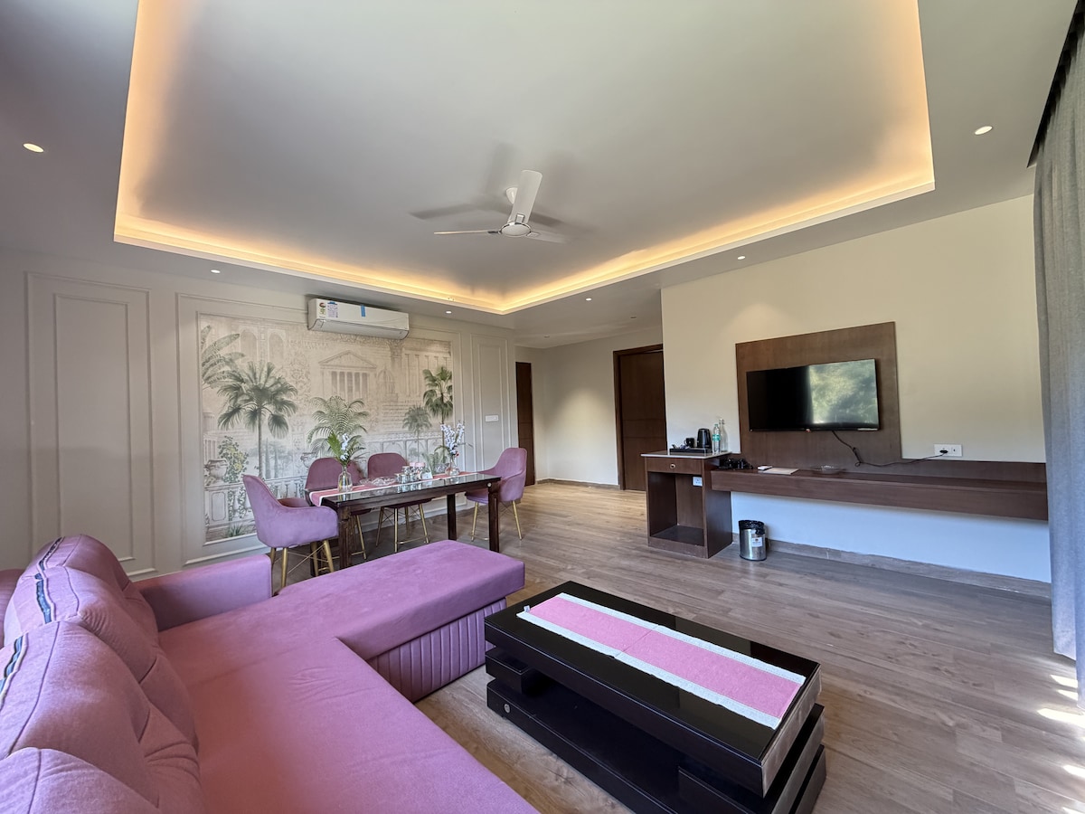 Visit us at Saraiville and stay at this experiential spacious suite featuring a cozy living room with sofa-cum-bed, TV and a dining area, perfect for families and couples. Step out to your private balcony and enjoy breathtaking river and mountain views. The beautiful bedroom offers scenic views and comes with an attached ensuite washroom. Order fresh, delicious meals from our kitchen anytime. Enjoy garden space, kids play area, swimming pool and multiple activities. 24x7 hot water + hot/cold AC.