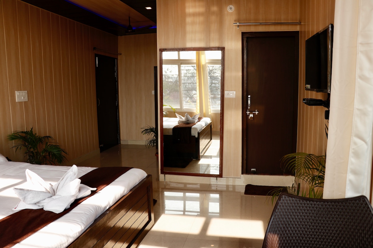 Visit us at Saraiville and stay at this experiential spacious suite featuring a cozy living room with sofa-cum-bed, TV and a dining area, perfect for families and couples. Step out to your private balcony and enjoy breathtaking river and mountain views. The beautiful bedroom offers scenic views and comes with an attached ensuite washroom. Order fresh, delicious meals from our kitchen anytime. Enjoy garden space, kids play area, swimming pool and multiple activities. 24x7 hot water + hot/cold AC.