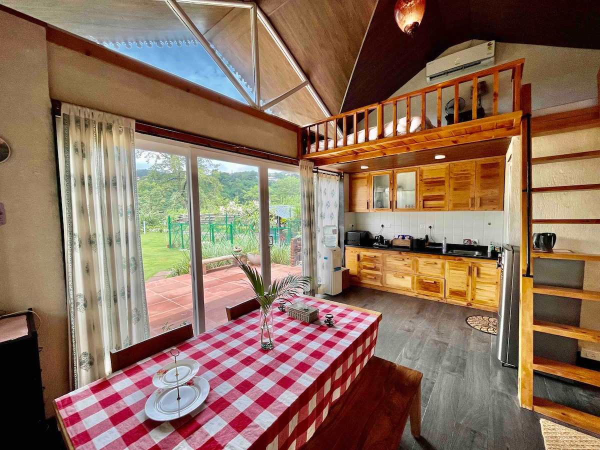 Retreat to a luxurious A-Frame cabin nestled within an amphitheatre of pristine forests on 3 acres of farmland estate in the Himalayan foothills. Wake up to musical birdsong in the densely wooded hillside bordering the property, sleep bathed in moonlight streaming through the magnificent twin skylights under starry nightsTastefully curated interiors, huge living spaces indoors & outdoors with the whole farm to explore, a bathtub for relaxing soaks and complete privacy from the outside world!