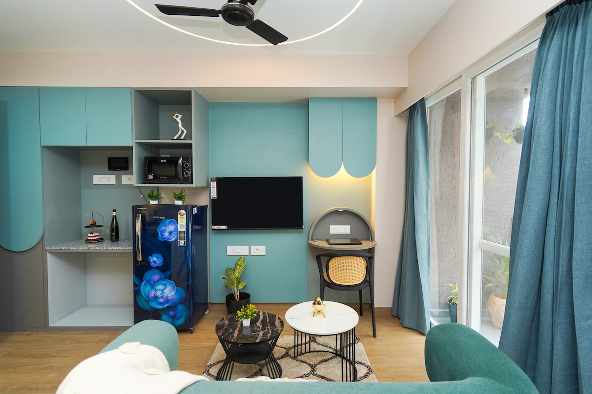 Escape to Zen Horizon, a stylish 1BHK sky suite perched on Pune’s 23rd floor. Wake up to panoramic skyline views, sip coffee on the balcony, and relax in a bright living room with smart TV. The cozy bedroom with premium bedding ensures restful nights, while the modern bathroom keeps you refreshed. A fully equipped kitchenette with microwave, fridge, and washer makes long stays easy. Perfect for family visits, or weekend getaways, this gated top-floor home blends comfort, convenience, and calm.