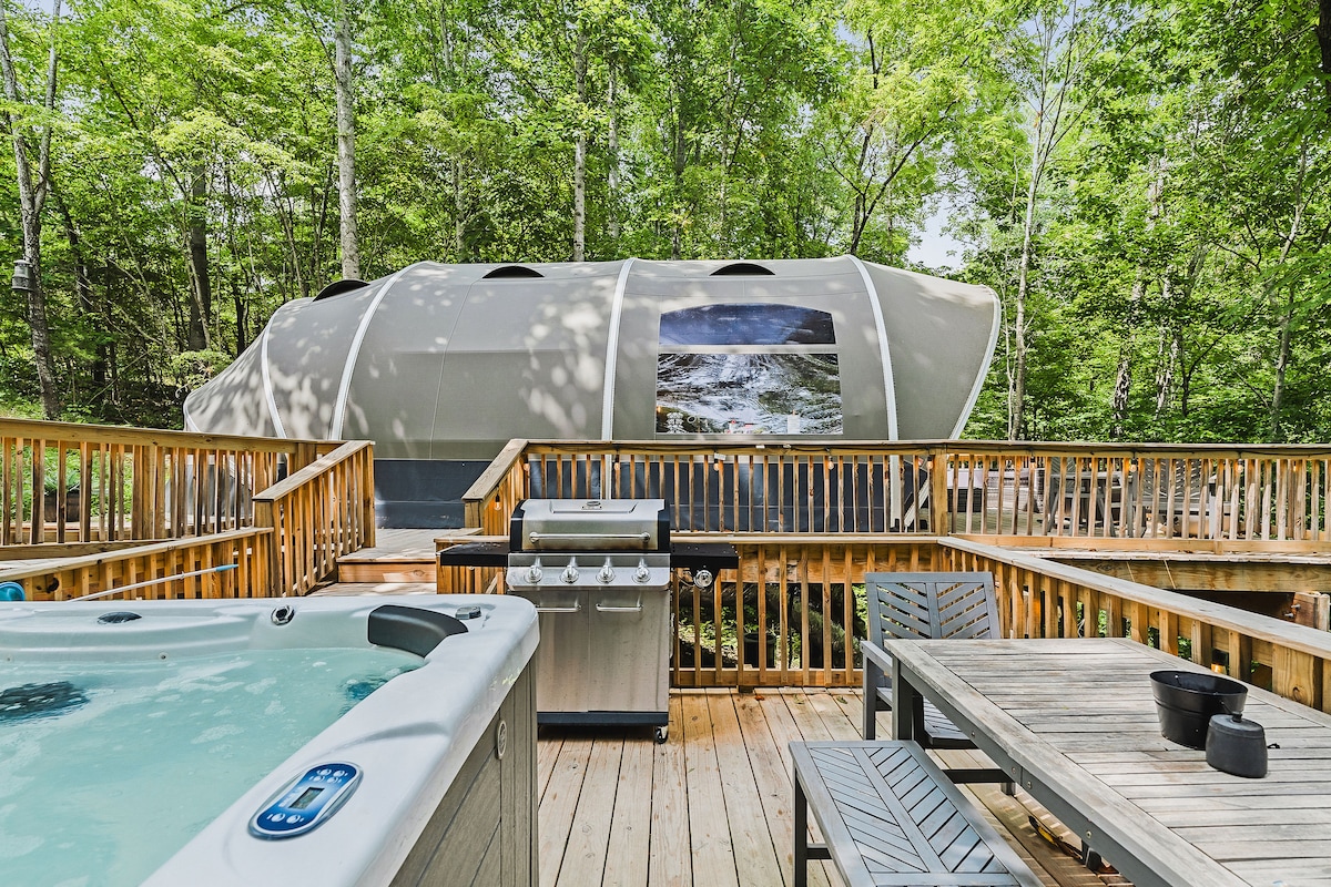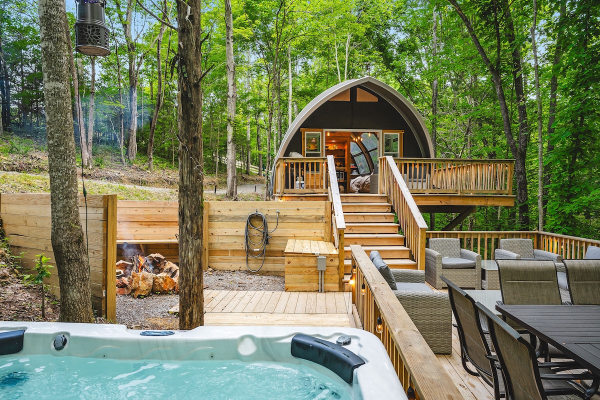 Nature meets luxury in this unique glamping dome experience. Enjoy the privacy of a peaceful, secluded setting, complete with everything you need for a one-of-a-kind getaway. Heating and A/C, full bathroom, Luxury Saatva mattresses & bedding. Functional kitchenette, and private outdoor living space with private hot tub and natural gas fire pit. Booked for your desired dates?! Check out our Highland Views Dome! Same amenities, same property! https://www.airbnb.com/h/ygahighlandview