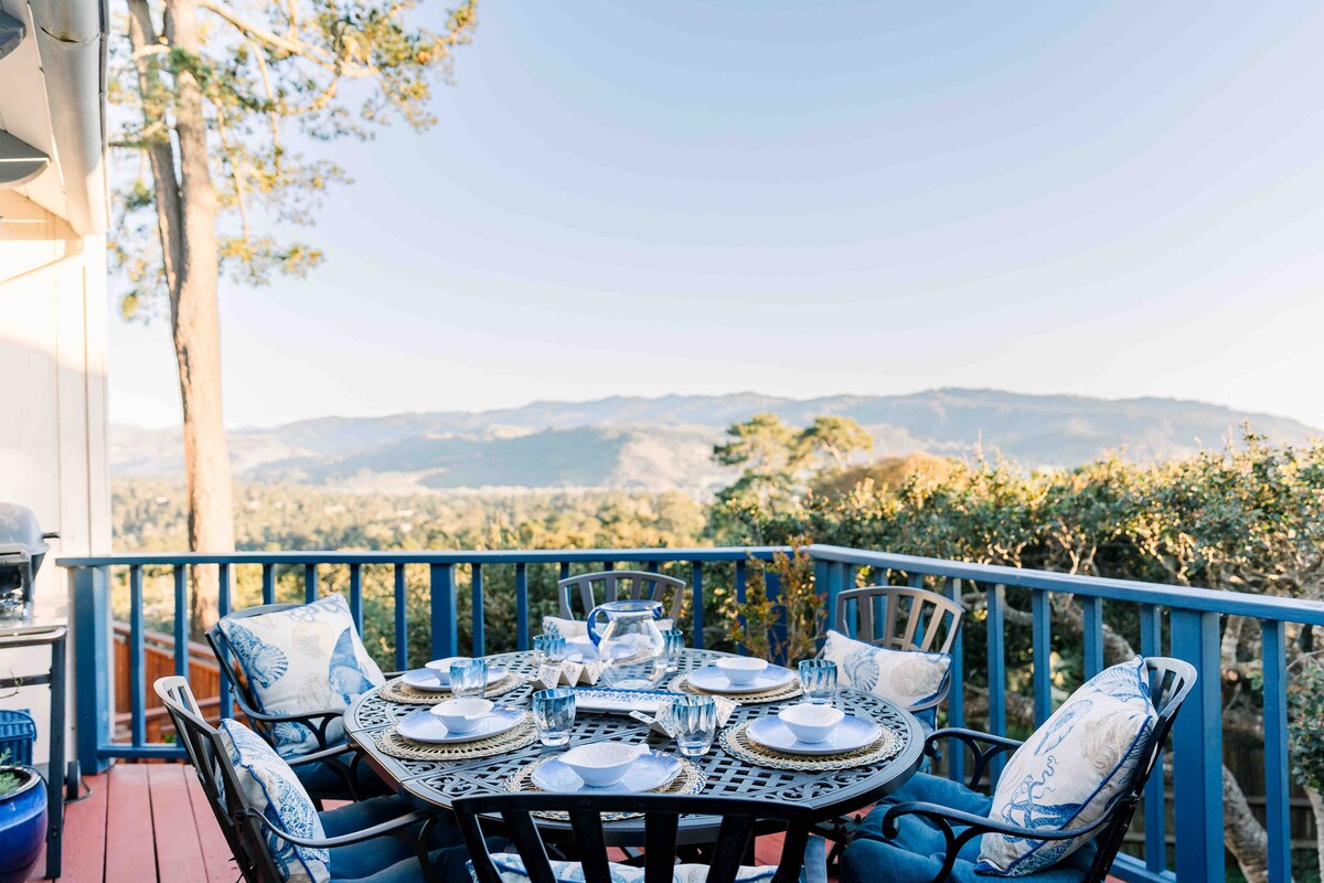 Spacious, light-filled Carmel hilltop home with large hot tub and sweeping views of ocean & forest. 🌲🌅 With 3 balconies + generous primary suite on main floor, this highly private retreat offers an elegant tranquility with coastal charm. Spacious 🍽️ fully stocked kitchen features espresso machine + conical burr grinder 🫘☕ as well as French Press and sizeable gas range. 3 bedrooms +3 pull-outs. Chore-free checkout. Property is *not* walkable to downtown Carmel. Outdoor BBQ is electric.