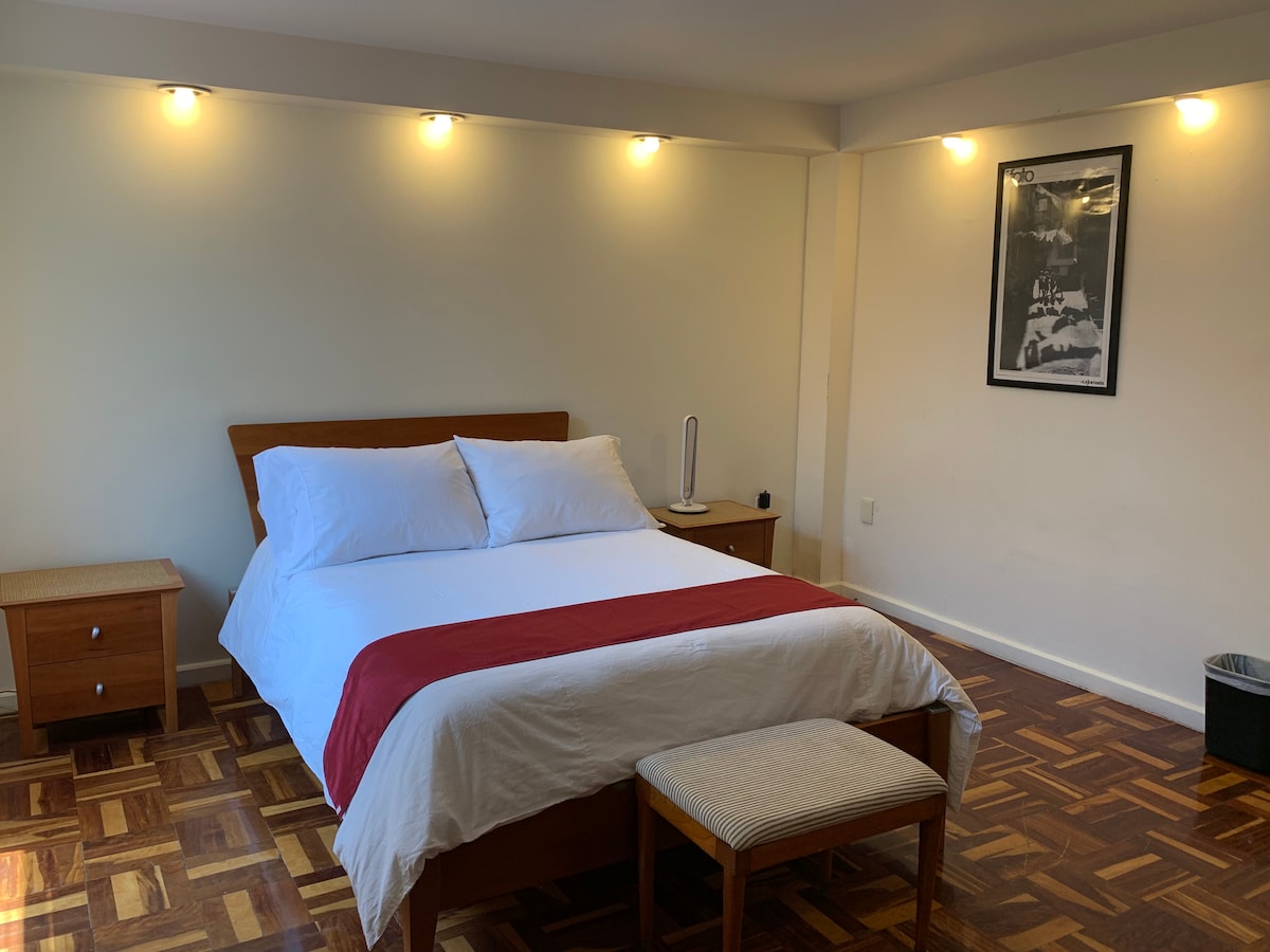 Departamento elegante con doble altura, balcón y amplia terraza con parrilla. Cuenta con 2 camas matrimoniales, sofá, amplios closets, escritorio de trabajo, refrigerador, smart TV y baño con AGUA CALIENTE Las luces se pueden manejar desde una app para escoger el color y ambiente que gustes. Dobla las escaleras del tapanco para aumentar tu espacio y sentirte aun mas cómodo. Cuenta con filtro de agua y todo lo necesario para cocinar en casa. Se permiten hasta 4 huespedes (costo extra )