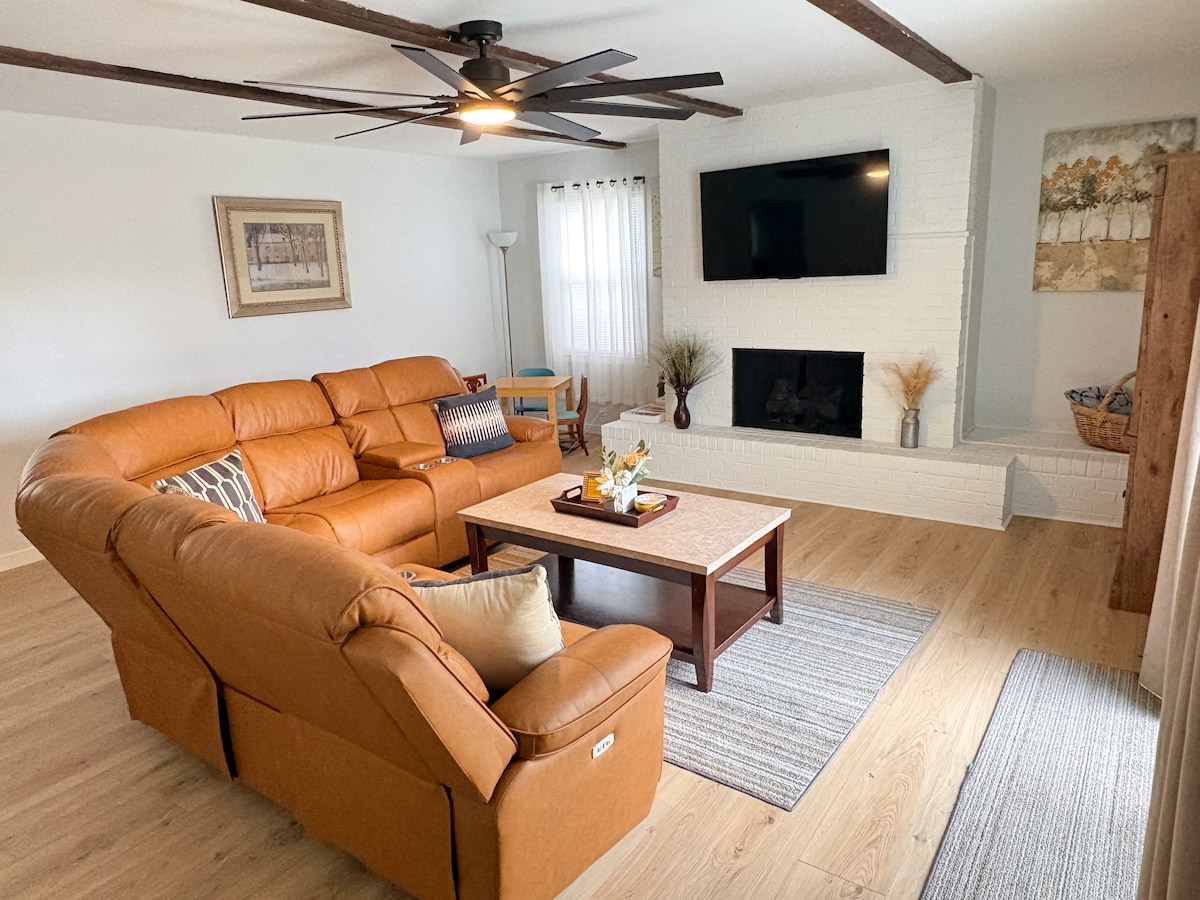 Located on 10 acres of beautiful country property, our 3 bedroom, 2 bath cabin comes fully equipped with all the comforts of home. The open floorplan is perfect for time away with your loved ones and comfortably sleeps up to 6 guests. Bedroom details: * Master bedroom with king bed, large closet, and full bath. * Queen bed with closet and full bath across the hall. * Large 2nd story loft with 2 twin beds, couch, and smart tv.