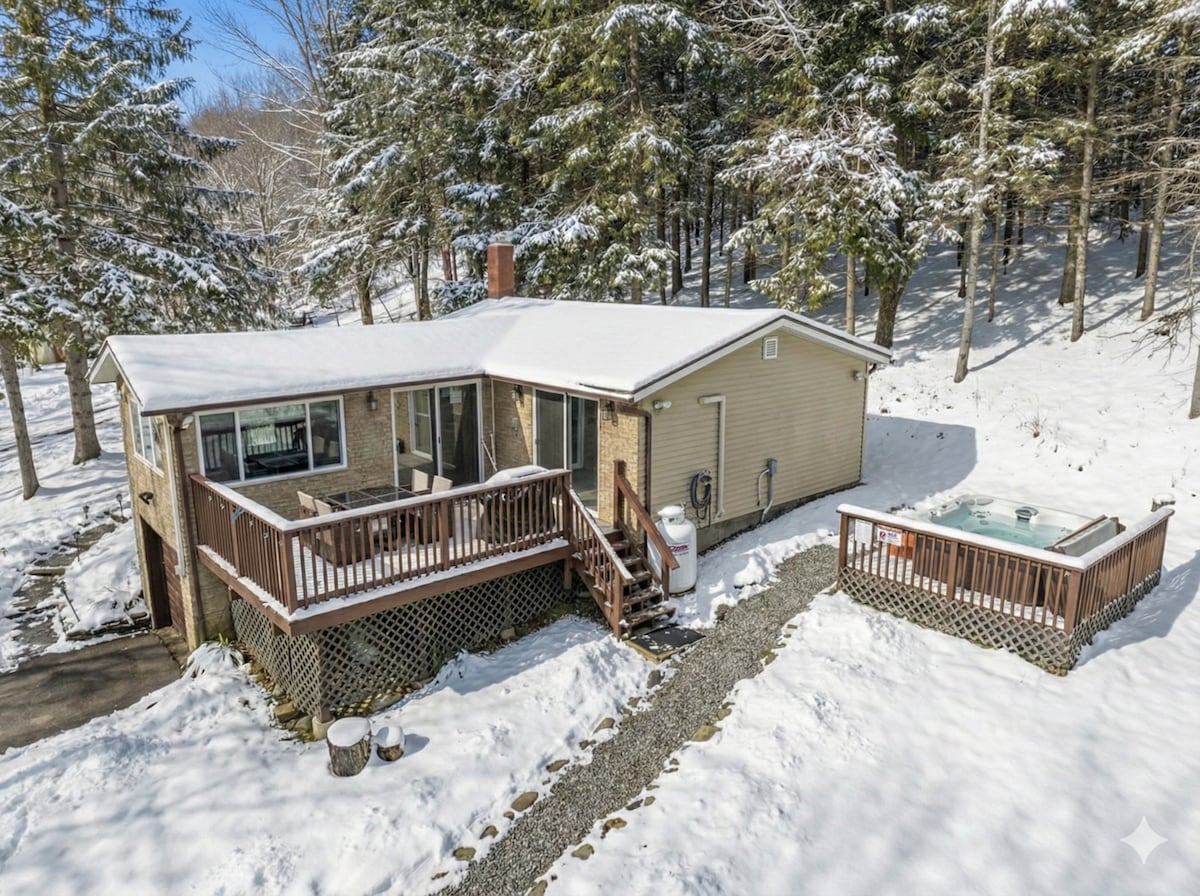 Welcome to the best sweeping views in all of the Catskills! This secluded getaway sits on more than 8 acres of land without a neighbor in sight! Whether you are looking to vacation with friends and family, or a romantic escape, this is the place for you. Enjoy this 3 BD 2.5 BA home year round, including our 8 person hot tub! Amenities galore including outdoor firepit, lounge chairs, sledding, BBQ, ping pong, board games, TV and more. This house is perfect for travelers of all types!