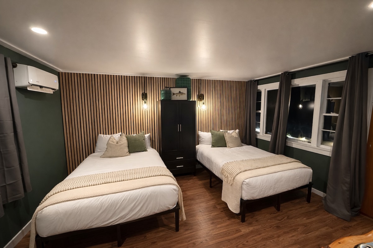This beautiful, newly-renovated with private bathroom, located in Stamford, NY. Features an inlaid, wood-paneled wall, 1 large window, original antique in the wall (decorative), queen bed w linen bedding.