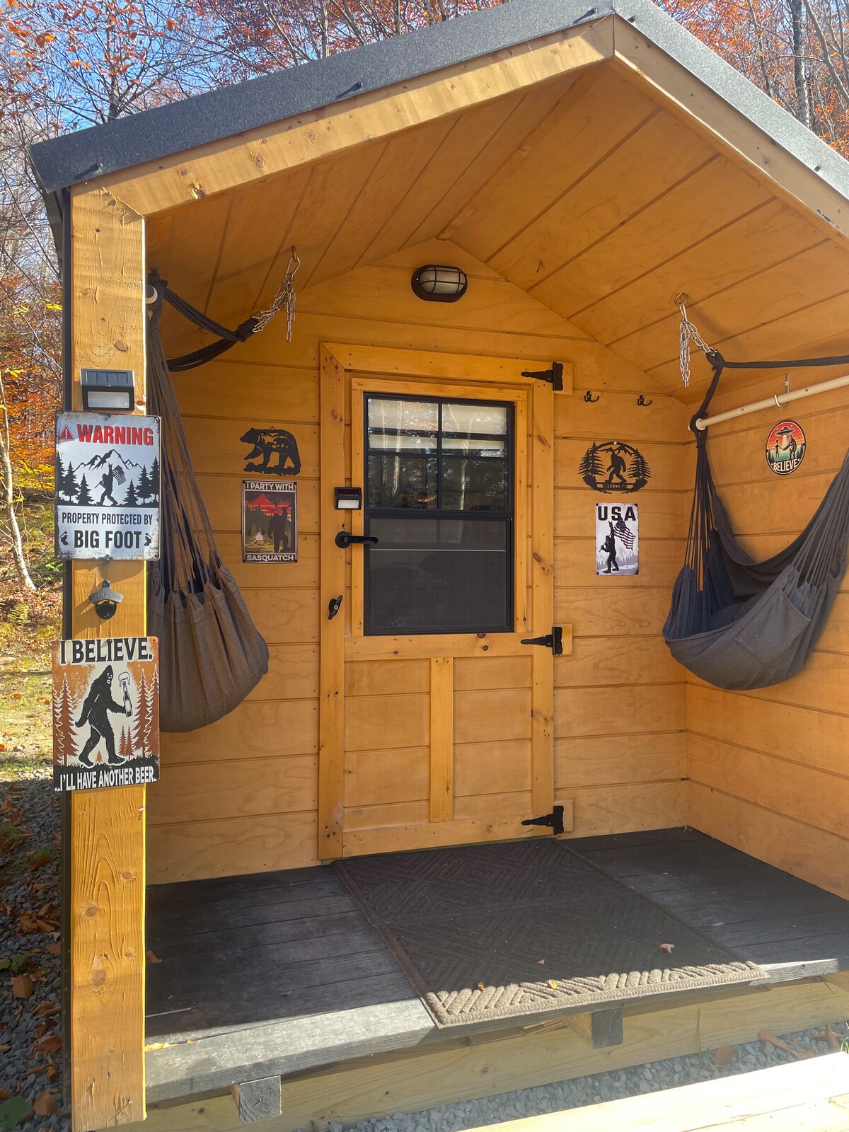 This off grid, alternative powered site is located towards the front of a large twelve acre estate, alongside a flowing brook. Elevated over a natural spring that flows year round, the Japanese inspired aesthetics of this private, tiny cabin sits perched atop a deck among the wooded trees overlooking the waterway the mineral spring feeds, but not before filling the in-ground, cedar lined, two person, bubbling hot tub heated with a wood burning stove. One of two glamping sites on the 12 acres.