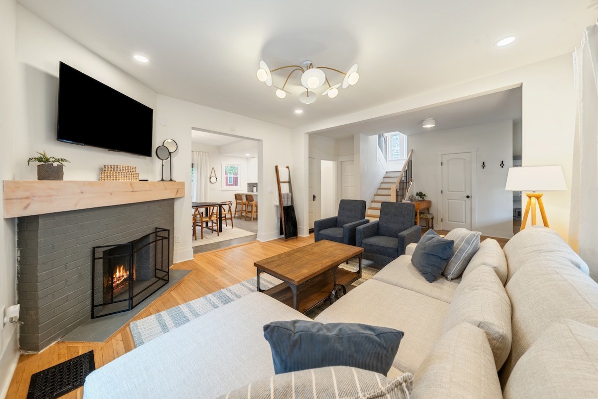Welcome to our beautifully renovated three-bedroom house! This modern and stylish home boasts comfortable accommodations with two queen beds and one king bed in the main room, each equipped with a TV. Relax and unwind in the spacious living area, complete with a cozy indoor fireplace and ample seating. Enjoy the convenience of two and a half bathrooms, including a bathtub for a relaxing soak after a long day. High speed wifi available.