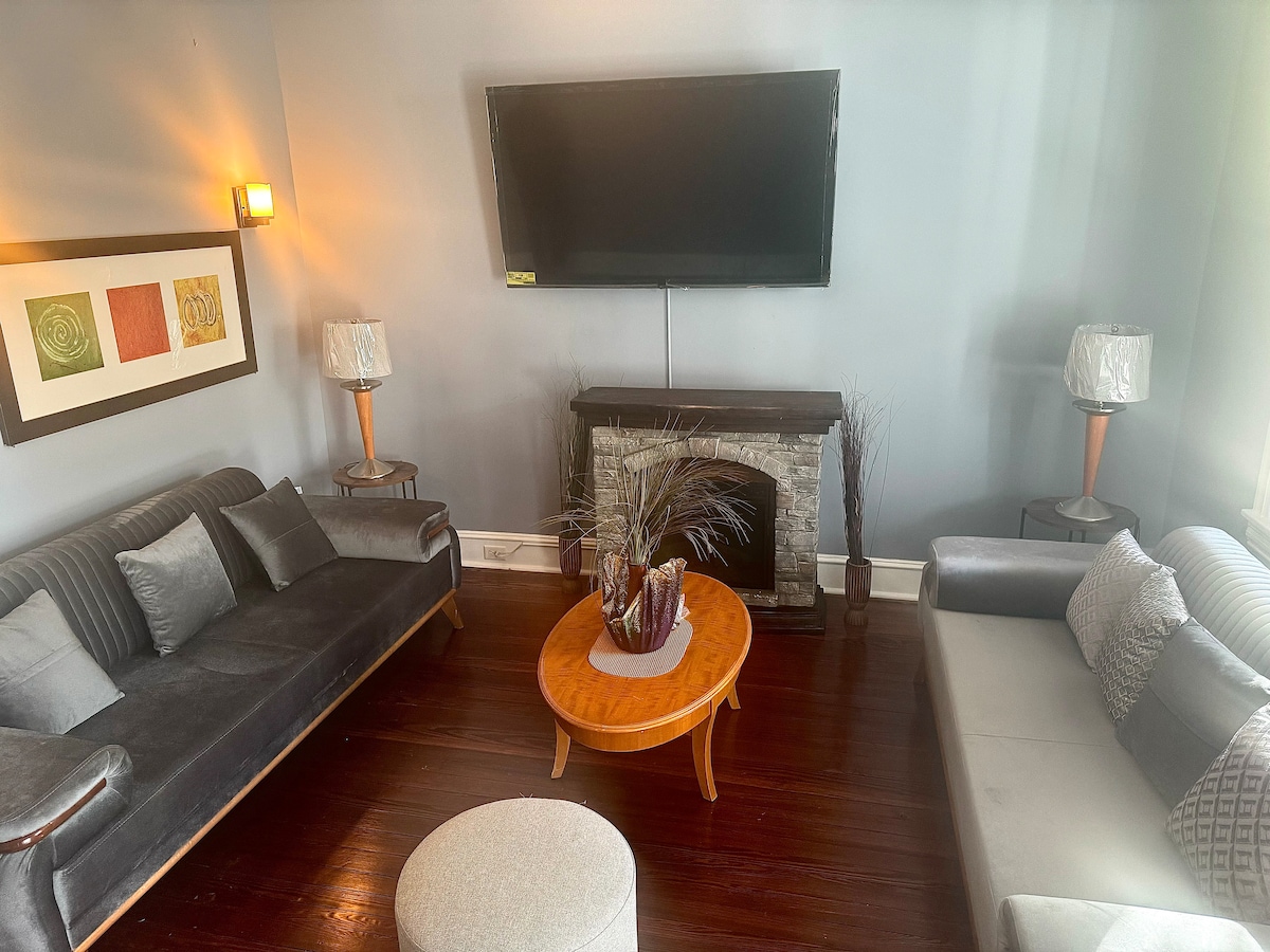 Step into style in this cozy 1 bed/1bath 1st floor unit. 2 car driveway. Keypad entry into living room w/ sleeper sofa, work desk, chair & 50 in Samsung smart TV. Kitchen with granite counter is fully equipped w/ everything you need and a breakfast bar to sit and eat meals. Granite is carried onto the bathroom vanity w/ plenty counter & drawer space stocked w/ amenities. BR has queen bed, dresser, walk in closet, smart tv and electric fireplace. Sliding door leads to yard w/ grill and bistro set