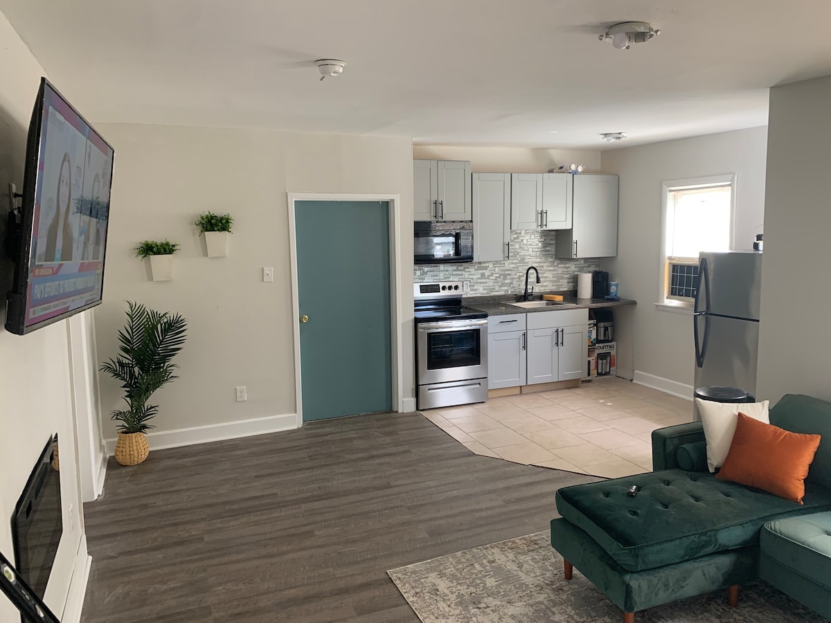 PRIVATE ENTRANCE, 2 VERY SPACIOUS ROOMS at bottom of the house /off street parking. 1st rm :Living Room areaTV, Fireplace/ Heater Unit, Sofa, Mini frig/mini freezer Bar/Seats , Kitchen Table, MICROWAVE,TOASTER/AIR FRYER OVEN not a full kitchen (see pics) 2nd rm: 1 QUEEN SIZE BED, 1 TWIN BED , TV, Close chest ,Sofa, Fireplace-Heat Unit, Desk, Mini Beverage Frig, Private Bathroom/ Stall Shower Amenities: CABLE, WIFI, TREADMILL, , COFFEE MAKER / COFFEE & TEA, SHEETS, TOWELS, central air