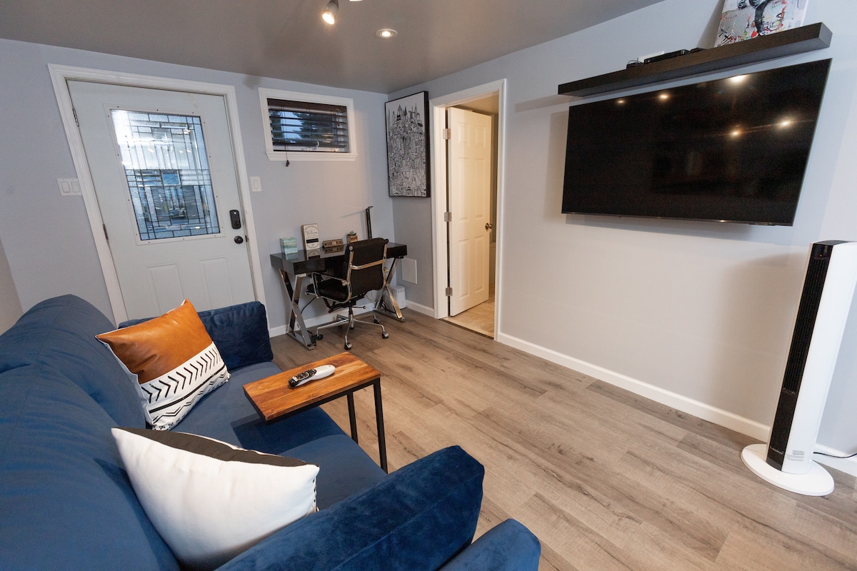 PRIVATE ENTRANCE, 2 VERY SPACIOUS ROOMS at bottom of the house /off street parking. 1st rm :Living Room areaTV, Fireplace/ Heater Unit, Sofa, Mini frig/mini freezer Bar/Seats , Kitchen Table, MICROWAVE,TOASTER/AIR FRYER OVEN not a full kitchen (see pics) 2nd rm: 1 QUEEN SIZE BED, 1 TWIN BED , TV, Close chest ,Sofa, Fireplace-Heat Unit, Desk, Mini Beverage Frig, Private Bathroom/ Stall Shower Amenities: CABLE, WIFI, TREADMILL, , COFFEE MAKER / COFFEE & TEA, SHEETS, TOWELS, central air