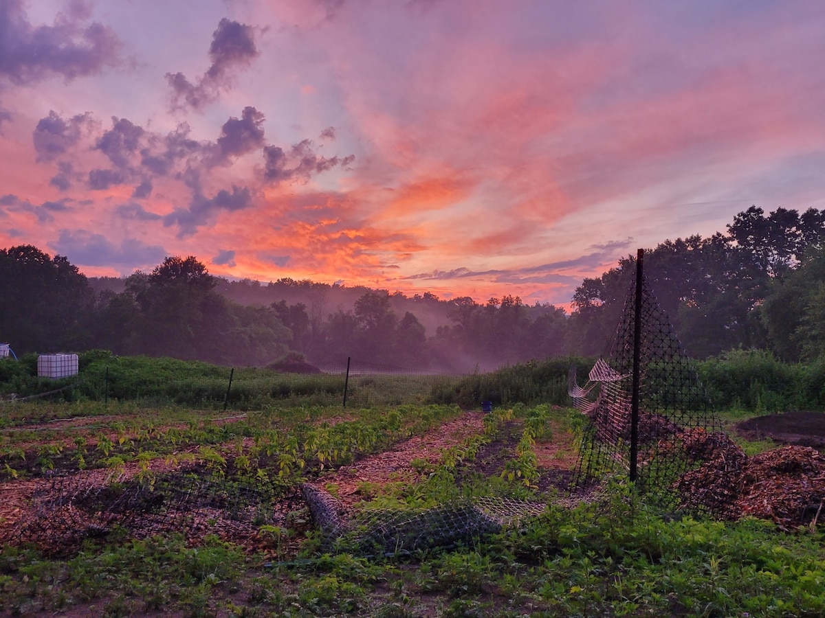 Enjoy nature in style at this fairytale in the forest. This idyllic escape combines whimsical structures, curated gathering spaces and a private wooded hillside surrounded by hiking trails and quaint towns. Disclaimer: This is a rustic cabin. Heating is from a wood-burning stove, there is no AC. The bath house is a separate structure from the cabin, up a hillside with stone steps. Cooking is via charcoal grills, small outdoor kitchenette or fire.