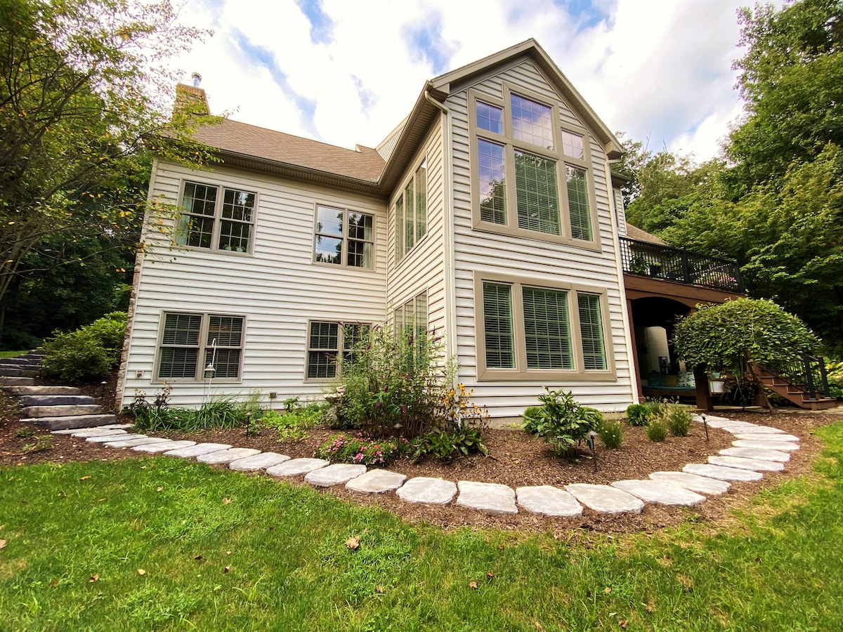 This 3 story victorian home sits on a treelined street nestled between a Quaker school and picturesque stone church. The 3rd floor apartment is resident occupied and the 1st and 2nd floors consist of 2+ bedrooms, kitchen, dining room and LR solely for AirBNB guests. Cozy up with a good book, cook a meal in the well appointed kitchen, relax by the outdoor fire pit and find your zen in the garden. Wifi and 2 parking spaces. Welcome to the Honeysuckle Hideout.