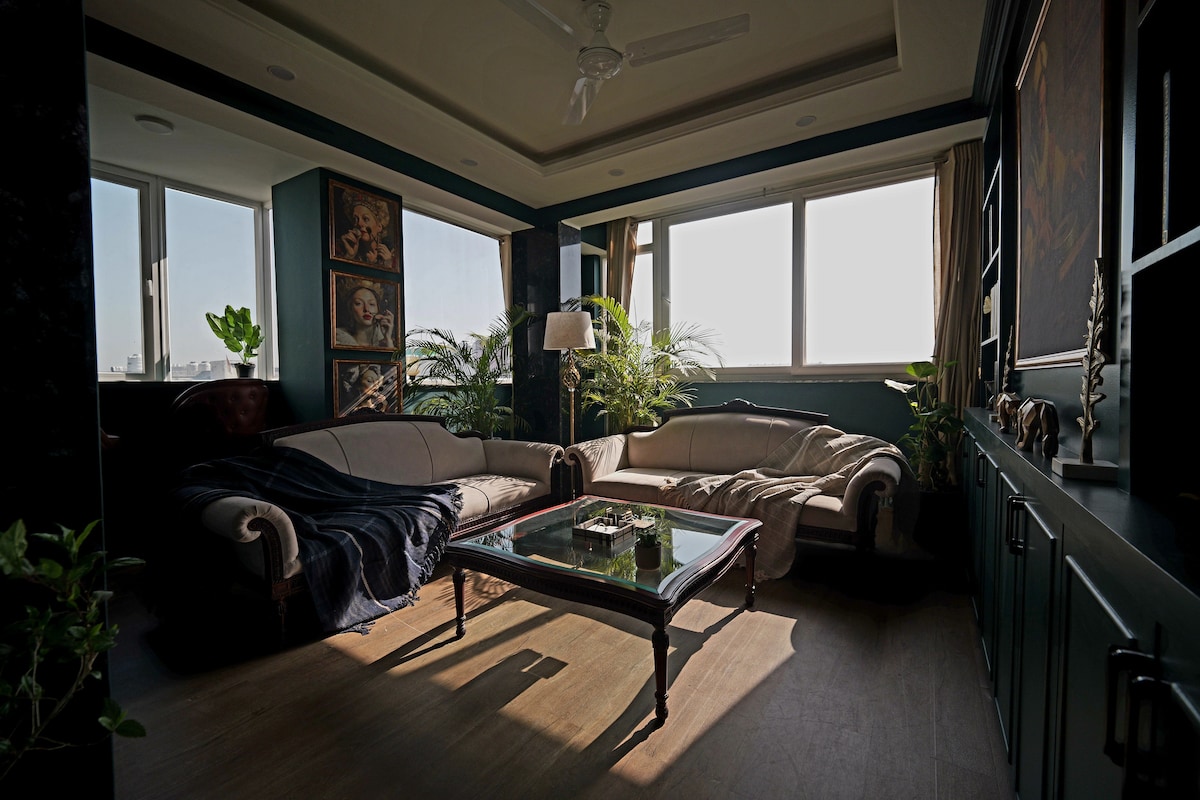 Nestled amidst the bustling Golf Course Road, yet offering a serene view of the Aravali forest range, this loft is a true urban oasis. Step into our spacious home with a living area, cozy dining area, and attached kitchen. Bedrooms offer rustic charm, comfy beds, ample storage, and access to peaceful terraces. A single bathroom is fully equipped. Enjoy views from two large terraces—one of the city and the other of the serene Aravali Forest, with a patio.
