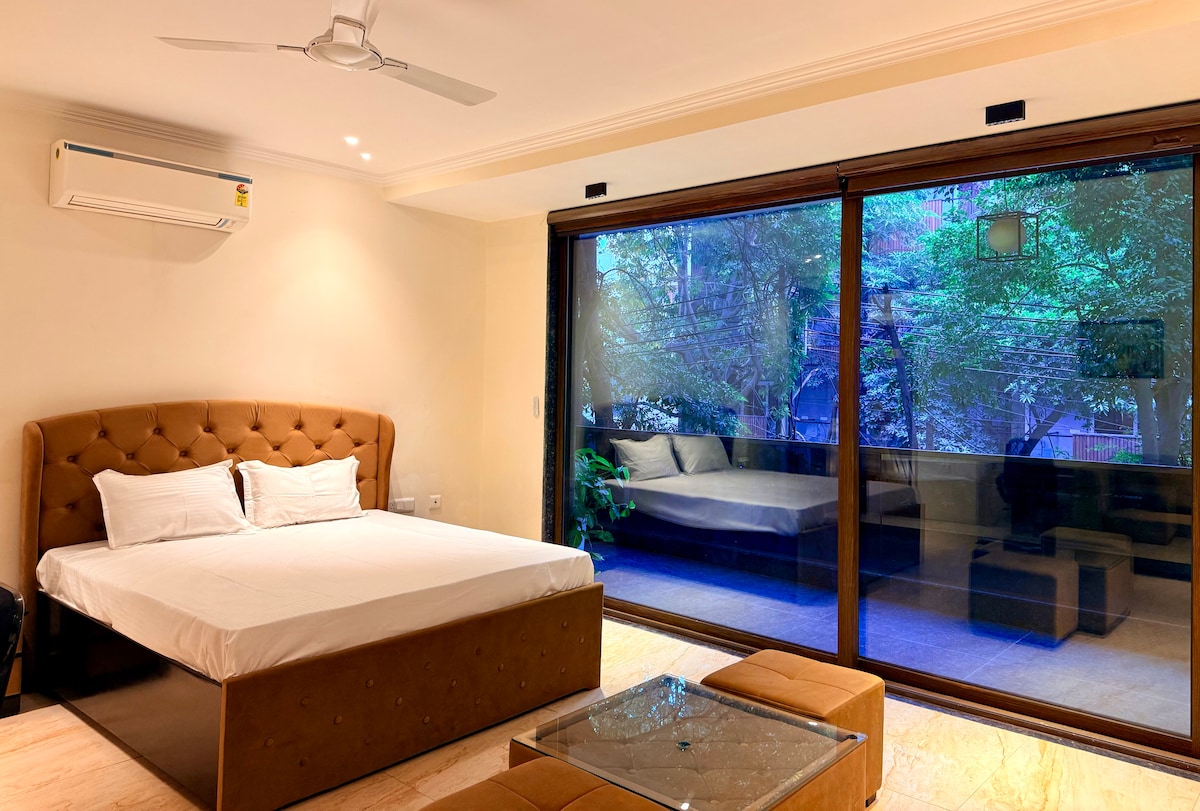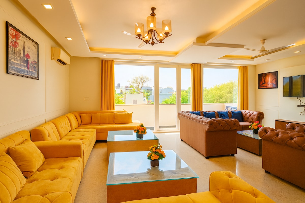 Welcome to GreenView: a bright and spacious 3-bedroom ground-floor stay in F-Block Saket, just 500 meters from Malviya Nagar Metro, PVR Anupam and Select CityWalk / DLF Avenue. Enjoy king beds, attached baths, AC/heating, air purifiers, smart TVs, workstations and premium linen. Unwind in the sunlit living room, cook in the fully equipped kitchen, or step out into the green parks right across the street. A calm, convenient South Delhi getaway.