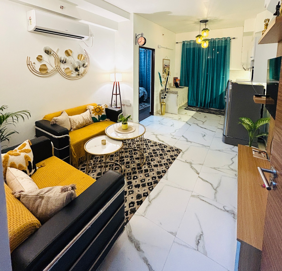 Discover unparalleled comfort in our Boho chic 1 BHK suite in Gurgaon. Enjoy a cozy living area, well-equipped kitchen, a lively bedroom, modern bathroom, and a balcony with stunning views. Stylish living space with books, board games, plants, and boho chic decor. Immerse yourself in luxury with full power backup and 24x7 security. Your comfort is our priority – experience a stay where every detail is crafted for your delight. Reserve now for a unique blend of sophistication and warmth!
